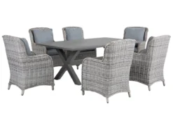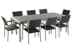 Conjunto De Jardín Mesa Con Tablero De Piedra Natural Pulida Gris 220 Cm, 8 Sillas En Ratán GROSSETO