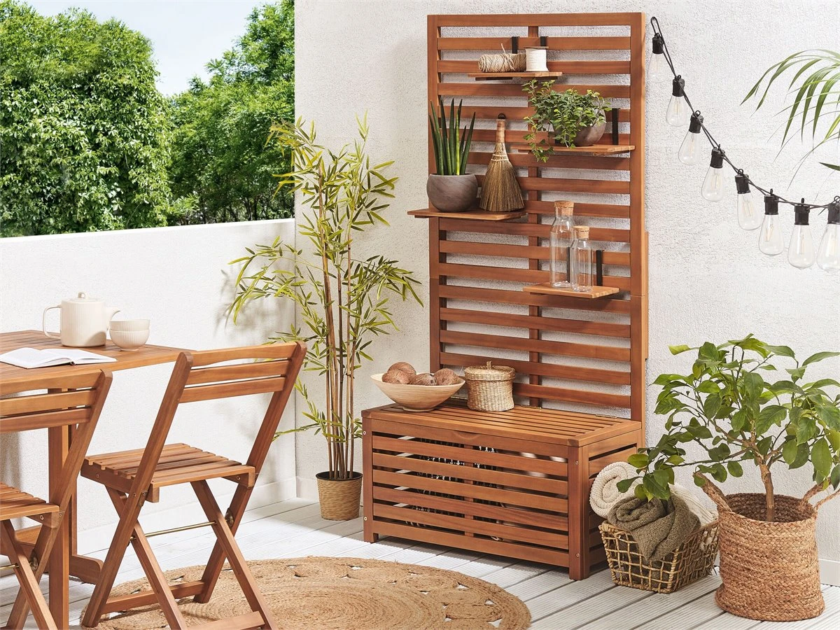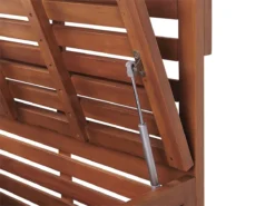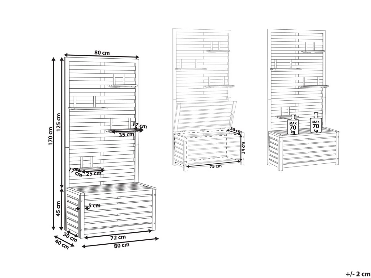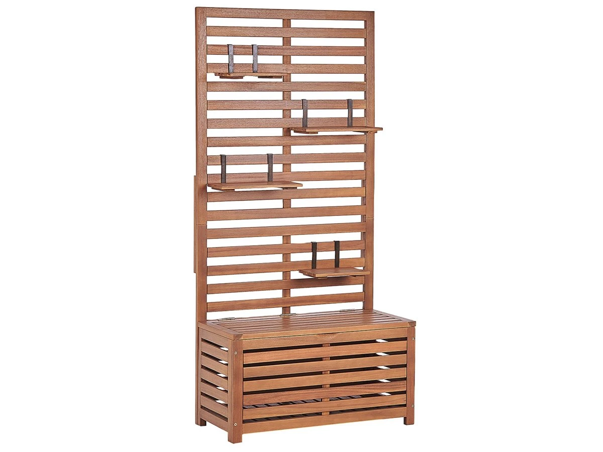 Banco de pared con almacenamiento. Este banco de pared con estantes y almacenamiento llena y aporta una cierta funcionalidad a tu balcón. Fabricado de madera de acacia, la estructura es duradera y resistente a condiciones exteriores. Los estantes ofrecen espacio para que puedas disponer y exhibir tus macetas. En el arcón puedes guardar tus utensilios de jardín o cojines de asiento. Detalles: Tipo de Producto: Banco Estilo: Rústico Color: Madera clara Tipo de material: Madera maciza Material principal: Madera de acacia Material adicional: Acero Dimensiones: Profundidad: 40 cm Altura del asiento: 40 cm Ancho: 80 cm Altura: 170 cm Superficie del asiento: 40×80 cm Peso: 18 kg Capacidad de peso: 140 kg La oferta incluye: 1 x Banco, 4 x Estante de pared Ventajas: Estantes ajustables en altura, Almacenamiento de fácil acceso para niños, Colores cálidos y elegantes, Los nudos y vetas de madera natural hacen que cada pieza sea única, Ideal para uso al aire libre, Espacio de almacenamiento funcional Información de montaje: Requiere montaje completo. 45-60 min. Información adicional: El producto viene con un libro de cuidados detallado para ayudarte a mantener tus muebles en las mejores condiciones durante muchos años. Consulta estos consejos para garantizar el mantenimiento adecuado de tus muebles nuevos – encontrarás las instrucciones de mantenimiento junto con el manual de montaje. Texto de resistencia: Gracias a su resistencia al agua, puedes utilizar el producto al aire libre y dejarlo a la intemperie durante lluvias ligeras. Si no es posible guardarlo en un lugar cerrado y protegido, recomendamos utilizar una funda protectora. La exposición prolongada a la humedad puede provocar daños en el mueble. Resistencia: Agua ligera / humedad Consejos de mantenimiento: Madera de acacia: 1.Durante el invierno o en condiciones climáticas adversas, utilice una funda protectora o guarde los muebles en el interior 2.Los muebles con acabado de aceite deben volverse a engrasar antes de ponerlos en uso y al menos una vez al año, especialmente en el clima húmedo 3.Limpiar con un limpiador suave y un paño suave en la dirección de la veta. Secar con un paño inmediatamente después de limpiar.