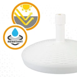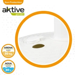 Soporte para sombrilla Aktive Garden forma circular. Tiene un diseño sencillo y elegante color blanco decorado con relieve. Mide Ø58 x 35 cm y es perfecta sombrillas con mástil desde 25 a 48 milímetros de diámetro, ya que el tubo tiene rosca ajustable. Está fabricada de poliresina, un material ligero, resistente al agua y a los rayos del sol. Cuenta con un depósito con tapón que se puede rellenar de agua (30 l o arena (30 kg. Ideal para asegurar la estabilidad y sujeción de tu sombrilla frente al viento.