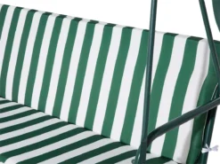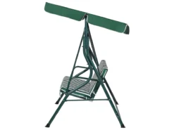 Columpio de jardín. Este columpio de jardín combina bien con cualquier decoración moderna. Está fabricado de acero con recubrimiento en polvo que garantiza durabilidad y estabilidad. El dosel de fibra sintética es resistente a las manchas y aporta un toque de relajación en los días más soleados. El respaldo alto y los asientos acolchados garantizan la máxima comodidad al sentarse. Detalles: Tipo de Producto: Columpio Estilo: Retro Color: Verde Tipo de material: Acero Material principal: Acero Material adicional: Poliéster Composición del Material: 100% Poliéster Acabado: Revestimiento en polvo Dimensiones: Altura del apoyabrazos: 18 cm Profundidad: 118 cm Espesor del asiento: 6 cm Altura del asiento: 53 cm Ancho: 174 cm Altura: 147 cm Superficie del asiento: 115×41 cm Peso: 13 kg Capacidad de peso: 260 kg La oferta incluye: 1 x Columpio Ventajas: La práctica cubertura brindará protección contra el viento y el sol, Las tiras ofrecen una fijación segura, Perfecto para todo tipo de exterior, Resistencia UV 3 (ISO 105-B02, Construcción muy estable Información de montaje: Requiere montaje completo. Más de 60 min. Texto de resistencia: Gracias a su resistencia al agua, puedes utilizar el producto al aire libre y dejarlo a la intemperie durante lluvias ligeras. Si no es posible guardarlo en un lugar cerrado y protegido, recomendamos utilizar una funda protectora. La exposición prolongada a la humedad puede provocar daños en el mueble. Resistencia: Agua ligera / humedad Consejos de mantenimiento: Poliéster: 1.Limpiar con champú seco y una esponja húmeda o un limpiador suave 2.Cuando no esté en uso, manténgalo en un lugar limpio y seco para protegerlo de las condiciones atmosféricas 3.Aspire con un accesorio adecuado. Acero: 1.Los muebles de acero y sus elementos no deben exponerse al agua. De lo contrario, existe la posibilidad de que el agua oxidada salga de las tuberías del marco 2.Cuando no estén en uso, los muebles deben guardarse en el interior o bajo una cubierta protectora 3.Para aumentar la durabilidad del artículo, manténgalo seco y recuerde la limpieza regular 4.Cualquier daño a la capa de pintura exterior debe protegerse de la humedad 5.Para garantizar la protección contra la corrosión, evite los limpiadores alcalinos o ácidos. Después de limpiar, secar bien 6.Quite las tapas protectoras con regularidad para que salga todo el líquido, déjelas secar y utilice un spray anticorrosión si es necesario 7.Limpiar con detergentes suaves.