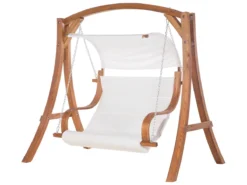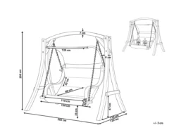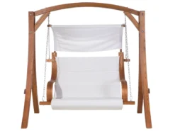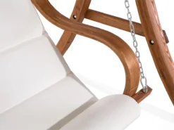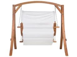 Columpio de jardín con toldo. Añade un cierto encanto a tu zona exterior con este columpio. Está fabricado a partir de madera de alerce duradera con un acabado en teca. El diseño curvo combina bien con su funcionalidad. Las cadenas y los enganches de acero son resistentes y garantizan estabilidad. La funda del asiento se puede limpiar fácilmente con una esponja húmeda. Detalles: Tipo de Producto: Columpio Estilo: Escandinavo Color: Madera oscura Tonalidad: Crema Tipo de material: Madera maciza Material principal: Madera de alerce Material adicional: Poliéster Composición del Material: 100% Poliéster Acabado: Pintado Dimensiones: Altura del apoyabrazos: 54 cm Profundidad: 120 cm Altura del asiento: 35 cm Ancho: 202 cm Altura: 200 cm Superficie del asiento: 110×60 cm Peso: 60 kg Capacidad de peso: 200 kg La oferta incluye: 1 x Columpio Ventajas: Ancha superficie del asiento, Perfecto para todo tipo de exterior, Solida estructura, Fabricación sólida y precisa, Resistencia UV 5 (ISO 105-B02, Mantenimiento sencillo Información de montaje: Requiere montaje completo. 45-60 min. Información adicional: El producto viene con un libro de cuidados detallado para ayudarte a mantener tus muebles en las mejores condiciones durante muchos años. Consulta estos consejos para garantizar el mantenimiento adecuado de tus muebles nuevos – encontrarás las instrucciones de mantenimiento junto con el manual de montaje. Texto de resistencia: Gracias a su resistencia al agua, puedes utilizar el producto al aire libre y dejarlo a la intemperie durante lluvias ligeras. Si no es posible guardarlo en un lugar cerrado y protegido, recomendamos utilizar una funda protectora. La exposición prolongada a la humedad puede provocar daños en el mueble. Resistencia: Agua ligera / humedad Consejos de mantenimiento: Poliéster: 1.Cuando no esté en uso, manténgalo en un lugar limpio y seco para protegerlo de las condiciones atmosféricas 2.Aspire con un accesorio adecuado 3.Limpiar con champú seco y una esponja húmeda o un limpiador suave. Madera de alerce: 1.Los muebles con acabado de aceite deben volverse a engrasar antes de ponerlos en uso y al menos una vez al año, especialmente en el clima húmedo 2.Limpiar con un limpiador suave y un paño suave en la dirección de la veta. Secar con un paño inmediatamente después de limpiar 3.Durante el invierno o en condiciones climáticas adversas, utilice una funda protectora o guarde los muebles en el interior.