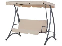Columpio de jardín con toldo. Añade un cierto encanto a tu zona exterior con este columpio. Está fabricado a partir de madera de alerce duradera con un acabado en teca. El diseño curvo combina bien con su funcionalidad. Las cadenas y los enganches de acero son resistentes y garantizan estabilidad. La funda del asiento se puede limpiar fácilmente con una esponja húmeda. Detalles: Tipo de Producto: Columpio Estilo: Escandinavo Color: Madera oscura Tonalidad: Crema Tipo de material: Madera maciza Material principal: Madera de alerce Material adicional: Poliéster Composición del Material: 100% Poliéster Acabado: Pintado Dimensiones: Altura del apoyabrazos: 54 cm Profundidad: 120 cm Altura del asiento: 35 cm Ancho: 202 cm Altura: 200 cm Superficie del asiento: 110×60 cm Peso: 60 kg Capacidad de peso: 200 kg La oferta incluye: 1 x Columpio Ventajas: Ancha superficie del asiento, Perfecto para todo tipo de exterior, Solida estructura, Fabricación sólida y precisa, Resistencia UV 5 (ISO 105-B02, Mantenimiento sencillo Información de montaje: Requiere montaje completo. 45-60 min. Información adicional: El producto viene con un libro de cuidados detallado para ayudarte a mantener tus muebles en las mejores condiciones durante muchos años. Consulta estos consejos para garantizar el mantenimiento adecuado de tus muebles nuevos – encontrarás las instrucciones de mantenimiento junto con el manual de montaje. Texto de resistencia: Gracias a su resistencia al agua, puedes utilizar el producto al aire libre y dejarlo a la intemperie durante lluvias ligeras. Si no es posible guardarlo en un lugar cerrado y protegido, recomendamos utilizar una funda protectora. La exposición prolongada a la humedad puede provocar daños en el mueble. Resistencia: Agua ligera / humedad Consejos de mantenimiento: Poliéster: 1.Cuando no esté en uso, manténgalo en un lugar limpio y seco para protegerlo de las condiciones atmosféricas 2.Aspire con un accesorio adecuado 3.Limpiar con champú seco y una esponja húmeda o un limpiador suave. Madera de alerce: 1.Los muebles con acabado de aceite deben volverse a engrasar antes de ponerlos en uso y al menos una vez al año, especialmente en el clima húmedo 2.Limpiar con un limpiador suave y un paño suave en la dirección de la veta. Secar con un paño inmediatamente después de limpiar 3.Durante el invierno o en condiciones climáticas adversas, utilice una funda protectora o guarde los muebles en el interior.