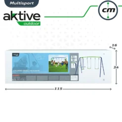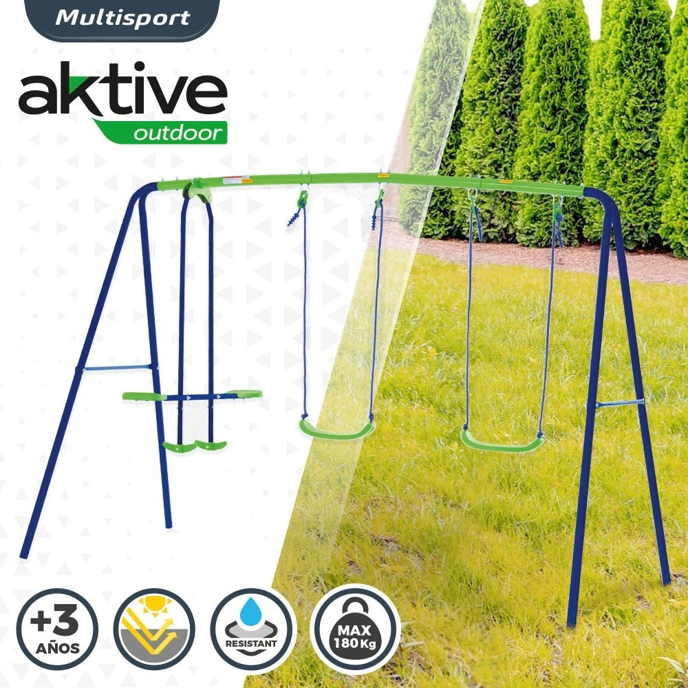 Columpio Aktive Sports con 2 asientos y 1 balancín, recomendado para 4 niños que no excedan de 180 kg en total. Completo columpio de 280x140x179 cm fabricado en metal recubierto con pintura epoxi antioxidante y PVC resistente. Asientos de 35,5x18x8,5 cm con cuerdas de 114 cm de largo. Balancín de 280x140x179 cm para 2 niños. Montaje sencillo, ideal para terraza o jardín. Recomendado a partir de 3 años. ¡Juega con Aktive!