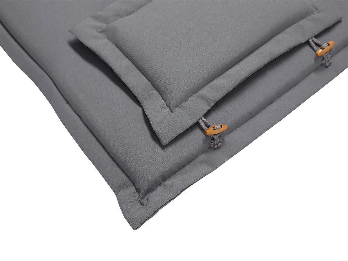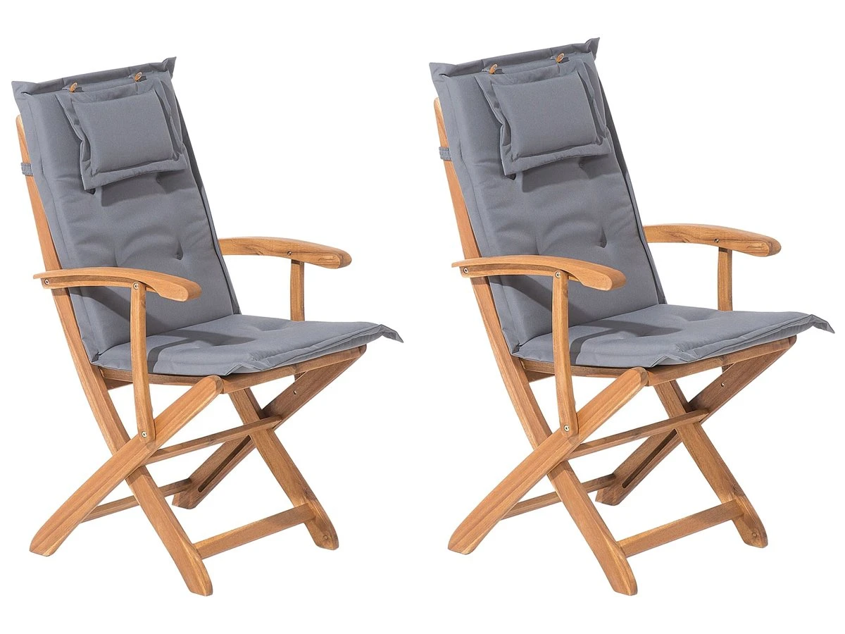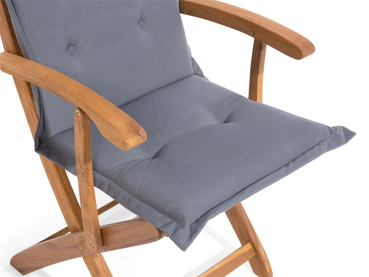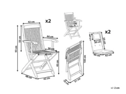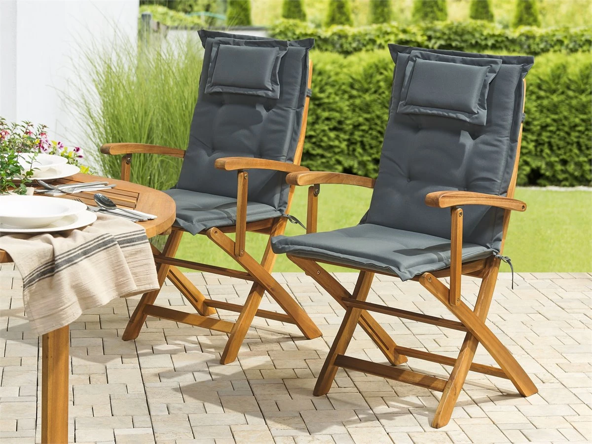 Conjunto de dos clásicas sillas de jardín con cojín. Este conjunto de 2 sillas de jardín con reposabrazos es perfecto para cualquier jardín o patio trasero. Las sillas están elaboradas a partir de madera de acacia clara y equipadas con cojines gruesos. Los reposabrazos garantizan el máximo confort al sentarse. La funda del cojín no incluye cremallera. El mecanismo de plegado te ayudará a ahorrar una gran cantidad de espacio. Detalles: Tipo de Producto: Silla de jardín Estilo: Tradicional Color: Madera clara Tonalidad: Grafito Tipo de material: Madera maciza Material principal: Madera de acacia Material adicional: Poliéster Material de las patas: Madera maciza Material del asiento: Tejido Composición del Material: 100% Poliéster Apoyabrazo: Sí Acabado: Aceitado Plegable: Sí Densidad de espuma del asiento: 18 kg/m3 Apilable: No Dimensiones: Altura del apoyabrazos: 65 cm Profundidad: 48 cm Espesor del asiento: 5 cm Altura del asiento: 43 cm Ancho: 42 cm Altura: 93 cm Superficie del asiento: 38×40 cm Peso: 9 kg Capacidad de peso: 130 kg La oferta incluye: 2 x Silla, 2 x Cojines del asiento Ventajas: Las tiras ofrecen una fijación segura, Confort del asiento óptimo, Diseño atemporal, Materiales de la más alta calidad, Resistencia UV 5 (ISO 105-B02, Mantenimiento sencillo, Plegable para un fácil almacenamiento Información de montaje: No requiere montaje Información adicional: El producto viene con un libro de cuidados detallado para ayudarte a mantener tus muebles en las mejores condiciones durante muchos años. Consulta estos consejos para garantizar el mantenimiento adecuado de tus muebles nuevos – encontrarás las instrucciones de mantenimiento junto con el manual de montaje. Texto de resistencia: Gracias a su resistencia al agua, puedes utilizar el producto al aire libre y dejarlo a la intemperie durante lluvias ligeras. Si no es posible guardarlo en un lugar cerrado y protegido, recomendamos utilizar una funda protectora. La exposición prolongada a la humedad puede provocar daños en el mueble. Resistencia: Agua ligera / humedad Consejos de mantenimiento: Madera de acacia: 1.Durante el invierno o en condiciones climáticas adversas, utilice una funda protectora o guarde los muebles en el interior 2.Los muebles con acabado de aceite deben volverse a engrasar antes de ponerlos en uso y al menos una vez al año, especialmente en el clima húmedo 3.Limpiar con un limpiador suave y un paño suave en la dirección de la veta. Secar con un paño inmediatamente después de limpiar. Poliéster: 1.Limpiar con champú seco y una esponja húmeda o un limpiador suave 2.Cuando no esté en uso, manténgalo en un lugar limpio y seco para protegerlo de las condiciones atmosféricas 3.Aspire con un accesorio adecuado.
