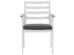 Juego de sillas de exterior. Disfruta de tu área de descanso al aire libre con este conjunto de 4 sillas de jardín. Están fabricadas a partir de aluminio con un recubrimiento en polvo para mayor durabilidad. El respaldo de listones aporta un toque escandinavo. Los reposabrazos están revestidos de madera sintética que protege del frío e introduce un poco de contraste. Incluye cojines de asiento a juego. Detalles: Tipo de Producto: Silla de jardín Estilo: Escandinavo Color: Blanco Tonalidad: Gris oscuro Tipo de material: Metal Material principal: Aluminio Material adicional: Madera plástica Material de las patas: Metal Material del asiento: Tejido Composición del Material: 100% Poliéster Apoyabrazo: Sí Acabado: Revestimiento en polvo Plegable: No Densidad de espuma del asiento: 14 kg/m3 Apilable: No Dimensiones: Altura del apoyabrazos: 63 cm Profundidad: 60 cm Espesor del asiento: 5 cm Altura del asiento: 40 cm Ancho: 54 cm Altura: 82 cm Superficie del asiento: 45×50 cm Peso: 5 kg Capacidad de peso: 150 kg La oferta incluye: 4 x Silla, 4 x Cojín del asiento Ventajas: Las tiras ofrecen una fijación segura, Cojines muy cómodos para un confort ideal, Estilo escandinavo minimalista, Robusto marco resistente a la corrosión, Resistencia UV 4 (ISO 105-B02, Patas con tapas anti-deslizantes Información de montaje: Requiere montaje completo. 45-60 min. Texto de resistencia: Gracias al acabado especial, la superficie del producto es resistente a la oxidación. Esto significa que se puede utilizar en exteriores. Cuando el producto no esté en uso, se recomienda cubrirlo con una cubierta o colocarlo en un lugar seco. Resistencia: Intemperie Consejos de mantenimiento: Aluminio: 1.Fuera de temporada, utilice una funda protectora o guarde los muebles en un lugar fresco y seco 2.Limpiar con agua jabonosa y detergentes suaves. Quitar el polvo con un paño suave. Poliéster: 1.No secar en secadora ni planchar 2.Lavar a mano únicamente, usar agua fría y un detergente suave 3.Cuando no esté en uso, manténgalo en un lugar limpio y seco para protegerlo de las condiciones atmosféricas.