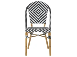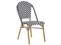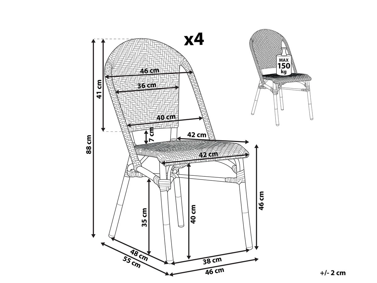 Conjunto de 4 sillas de jardín. Gracias a su llamativo tejido de formas geométricas, este conjunto de 4 sillas es perfecto para cualquier patio, balcón o comedor. Fabricadas con un marco de aluminio y asientos que imitan al ratán, las sillas son idóneas para usar tanto en exteriores como en interiores. Permiten ser apiladas, lo que las hace ideales para jardines pequeños o habitaciones de espacio reducido. Combínalas con una mesa de la misma colección y crea un lugar soleado donde relajarte. Detalles: Tipo de Producto: Silla de jardín Estilo: Retro Color: Negro Tipo de material: Ratán sintético Material principal: Ratán sintético Material adicional: Aluminio Material de las patas: Metal Material del asiento: Mimbre sintético Apoyabrazo: No Acabado: Revestimiento en polvo Plegable: No Apilable: Sí Dimensiones: Profundidad: 55 cm Altura del asiento: 40 cm Ancho: 46 cm Altura: 88 cm Superficie del asiento: 42×42 cm Peso: 4 kg Capacidad de peso: 150 kg La oferta incluye: 4 x Silla Ventajas: Perfecto para todo tipo de exterior, Ideal para uso en interiores y exteriores, Ligero y sólido a la vez, muy fácil de mover, Apilable para un almacenaje mejor, Patas con tapas anti-deslizantes Información de montaje: No requiere montaje Texto de resistencia: El producto está fabricado con materiales altamente resistentes a las manchas, por lo que la suciedad no empapará el producto y debería ser fácil de eliminar. Cuando elimine las manchas, siga el manual de cuidado del producto. Resistencia: Manchas Consejos de mantenimiento: Ratán sintético: 1.Para alargar la vida útil del mueble, protéjalo de la exposición directa al sol 2.Se recomienda utilizar una funda protectora para la temporada de invierno o, si es posible, para mantener los muebles secos y frescos en el interior 3.Limpiar con detergentes a base de jabón. No utilizar limpiadores químicos corrosivos 4.Los utensilios o accesorios de vidrio pueden sobrecalentar la superficie. Aluminio: 1.Fuera de temporada, utilice una funda protectora o guarde los muebles en un lugar fresco y seco 2.Limpiar con agua jabonosa y detergentes suaves. Quitar el polvo con un paño suave.