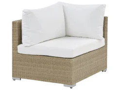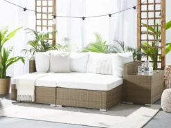 Juego de jardín de ratán sintético. Añade a tu espacio al aire libre este conjunto de exterior de diseño moderno. Está constituido por 2 asientos modulares y una mesa auxiliar de tablero de vidrio. Fabricado a partir de ratán sintético de alta calidad y resistente a los rayos UV. Cada superficie para sentarse viene con un cojín acolchado grueso. Detalles: Tipo de Producto: Conjunto de jardín Estilo: Moderno Color: Marrón Tonalidad: Blanco crema Tipo de material: Ratán sintético Material principal: Ratán sintético Material adicional: Aluminio Composición del Material: 100% Poliéster Acabado: Cepillado Densidad de espuma del asiento: 25 kg/m3 Dimensiones: Dimensiones del sillón: 94x73x75 Dimensiones del reposapies: 86x66x39 cm Espesor del asiento: 9 cm Altura del asiento: 39 cm Dimensiones de la mesa auxiliar: 74x41x49 Peso: 52 kg Capacidad de peso de la mesa: 10 kg Capacidad de peso por persona: 120 kg La oferta incluye: 1 x Mesa auxiliar, 4 x Cojín del asiento, 4 x Cojín del respaldo, 2 x Rinconera, 2 x Puf Ventajas: Tablero grueso de vidrio templado resistente, Confort del asiento óptimo, Resistencia UV 5 (ISO 105-B02, Muchas posibilidades de posición, Apilable para un almacenaje mejor, Fundas extraíbles, Tablero en vidrio templado de seguridad Información de montaje: No requiere montaje Información adicional: Los clientes que deseen comprar fundas de cojines adicionales, para uno de nuestros conjuntos de muebles para exterior comprados anteriormente, tienen que tener en cuenta que es posible que el color no sea idéntico al original incluido en la oferta. Para asegurarse de obtener las fundas correspondientes, comunícate con nuestro Servicio al Cliente. Texto de resistencia: Gracias a su resistencia al agua, puedes utilizar el producto al aire libre y dejarlo a la intemperie durante lluvias ligeras. Si no es posible guardarlo en un lugar cerrado y protegido, recomendamos utilizar una funda protectora. La exposición prolongada a la humedad puede provocar daños en el mueble. Resistencia: Agua ligera / humedad Consejos de mantenimiento: Ratán sintético: 1.Los utensilios o accesorios de vidrio pueden sobrecalentar la superficie 2.Para alargar la vida útil del mueble, protéjalo de la exposición directa al sol 3.Se recomienda utilizar una funda protectora para la temporada de invierno o, si es posible, para mantener los muebles secos y frescos en el interior 4.Limpiar con detergentes a base de jabón. No utilizar limpiadores químicos corrosivos. Poliéster: 1.Cuando no esté en uso, manténgalo en un lugar limpio y seco para protegerlo de las condiciones atmosféricas 2.No secar en secadora y no planchar 3.Lavar a mano o seleccionar un ciclo de lavado de lana (30 ° C, a menos que el fabricante especifique lo contrario. Lavar del revés con la cremallera cerrada.