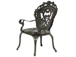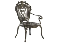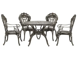 Conjunto de jardín estilo vintage. Mejora la decoración de tu espacio al aire libre con este juego de comedor de inspiración vintage. Ligero pero duradero gracias a la construcción de aluminio, el conjunto incluye una mesa redonda y cuatro sillas. Cuenta con hermosas líneas curvilíneas, patrones intrincados y acabado marrón que le dan un aspecto único y sofisticado. El juego viene con cuatro cojines de asiento rellenas de espuma ligera para mayor comodidad. Detalles: Tipo de Producto: Conjunto de comedor Estilo: Retro Color: Marrón Tonalidad: Marrón oscuro Tipo de material: Metal Material principal: Aluminio Material adicional: Poliéster Material de la superficie: Metal Composición del Material: 100% Poliéster Acabado: Pulido Densidad de espuma del asiento: 28 kg/m3 Dimensiones: Dimensiones de la silla: 58x97x69 cm Espesor del asiento: 5 cm Altura del asiento: 41 cm Dimensiones de la mesa: 100x72x100 cm Peso: 39 kg Capacidad de peso de la silla: 150 kg Capacidad de peso de la mesa: 150 kg La oferta incluye: 4 x Silla, 1 x Mesa, 4 x Cojín del asiento Ventajas: Tablero con agujero para sombrilla, Diseño elegante, Robusto marco resistente a la corrosión, Pieza estable y robusta, Resistencia UV 4 (ISO 105-B02, Ideal para uso al aire libre, Fundas extraíbles Información de montaje: Requiere montaje de las patas. 20-40 min. Información adicional: El efecto desgastado o las manchas visibles son intencionales y no se consideran un defecto. Texto de resistencia: El producto es resistente al agua, lo que significa que no se dañará expuesto a la lluvia o en contacto con otros líquidos. Puede dejarlo al aire libre incluso durante fuertes lluvias o humedad. Durante la temporada de invierno es recomendable almacenar el producto en el interior o bajo una cubierta impermeable. Resistencia: Agua Consejos de mantenimiento: Aluminio: 1.Limpiar con agua jabonosa y detergentes suaves. Quitar el polvo con un paño suave 2.Fuera de temporada, utilice una funda protectora o guarde los muebles en un lugar fresco y seco.