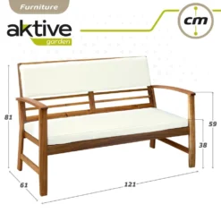 Conjunto de muebles de jardín Aktive Garden con mesa, banco y sillones. Son demadera de Acacia proveniente de bosques sostenibles. El acabado en aceite protege la madera y resalta su color y veta natural. Para uso exterior, el banco doble y los 2 sillones tienen el respaldo acolchado e incluyen cojines color crudo. Medidas mesa: 75x51x34 cm, sillones: 60x61x81 cm y banco: 121x61x81 cm.