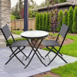 - Materiales: conjunto con estructura de acero, mesa con tablero de cristal templado y sillas con tejido de textileno. Set duradero, resistente a la intemperie y fácil de limpiar
