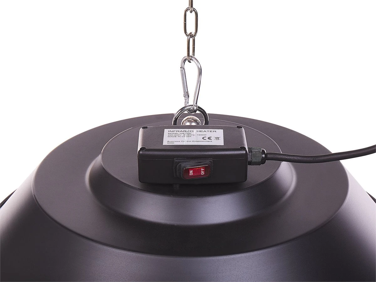 Calentador de exterior. Esta estufa eléctrica de exterior con forma de lámpara es, a su vez, decorativa y funcional. La luz generada se asemeja a la de los rayos de sol. El interruptor ubicado en la parte superior del calefactor permite apagar el dispositivo. Detalles: Tipo de Producto: Estufa de patio Color: Negro Tipo de material: Metal Material principal: Aluminio Código de protección IP: IP 44 (Impermeable Consumo de potencia: 1500 W Montaje: Colgante Dimensiones: Longitud del cable: 185 cm Profundidad: 44 cm Ancho: 44 cm Altura: 61 cm Peso: 3 kg La oferta incluye: 1 x Estufa de exterior Ventajas: Perfecto para todo tipo de exterior, Cumple con los estándares PAH, RoHS y SAA, Certificados GS, CE, CB, Ideal para uso al aire libre Información de montaje: Requiere montaje parcial. 20-40 min. Información adicional: La estufa requiere hasta 5 minutos para alcanzar su máxima potencia de calentamiento, Distancia mínima: 25 cm de la pared, 50 cm del techo, 180 cm del suelo, La distancia óptima de calentamiento es de 2 metros. Aunque se puede sentir el calor a mayor distancia, se recomienda colocar el dispositivo lo más cerca posible y así aprovechar al máximo su potencial. Consejos de mantenimiento: Aluminio: 1.Antes de comenzar a limpiar, desconecta el enchufe. No toques la estufa cuando esté caliente o no se haya enfriado por completo 2.Limpiar con un paño húmedo, 3.No meter en el agua.