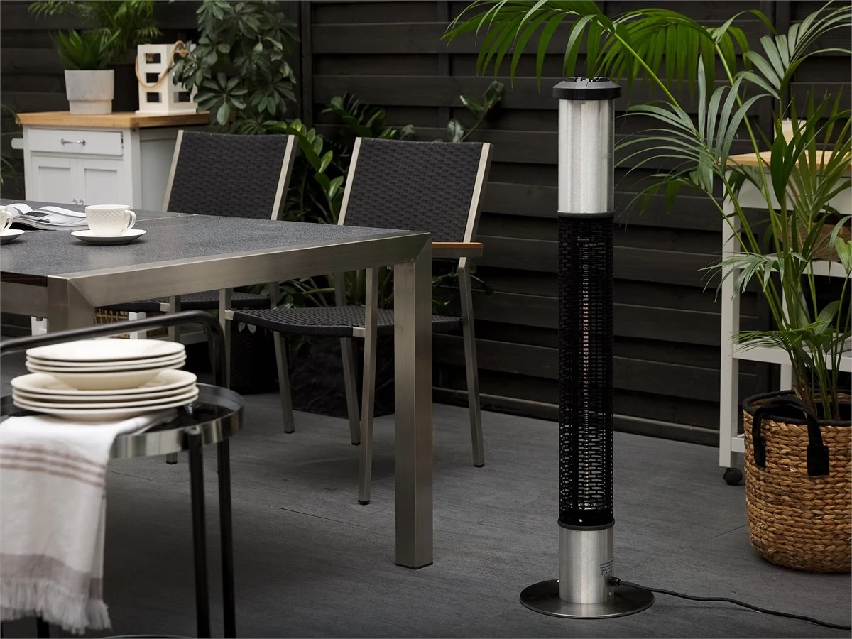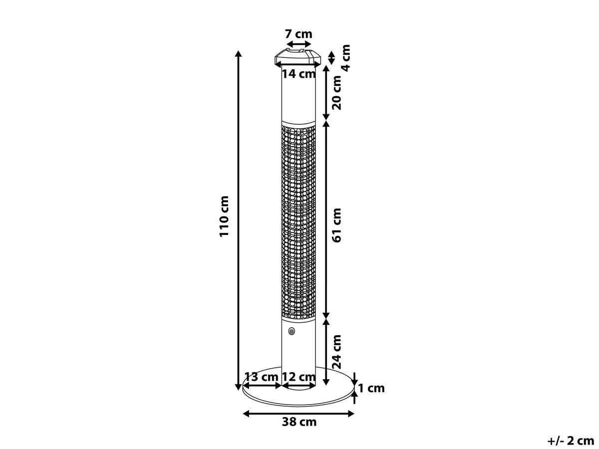 Disfruta del aire libre con la estufa de terraza . Manténgase cálido durante las fiestas de celebración con el calentador eléctrico. El elegante diseño hace que combine con cualquier decoración al aire libre. Fácil de transportar gracias a la forma funcional. Cuenta con un cenicero incorporado en la parte superior de la estufa. Añade un toque de calidez a su espacio de entretenimiento al aire libre con la estufa de terraza. Detalles: Tipo de Producto: Estufa de patio Color: Negro Tipo de material: Metal Material principal: Aluminio Conexión / Terminal: 13 A Código de protección IP: IP 55 (anti polvo y humedad Consumo de potencia: 1500 W Montaje: Independiente Dimensiones: Longitud del cable: 180 cm Profundidad: 38 cm Ancho: 38 cm Altura: 110 cm Peso: 10 kg La oferta incluye: 1 x Estufa de exterior Ventajas: Función antivuelco para mayor seguridad, Crea un ambiente acogedor, Brinda un toque acogedor a cualquier espacio, Certificados GS, CE, CB, Materiales pensados para el uso en el exterior, Cumple con los estándares PAH, RoHS y SAA, Rápido y fácil de usar Información de montaje: Requiere montaje parcial. 5-15 min. Información adicional: La estufa requiere hasta 5 minutos para alcanzar su máxima potencia de calentamiento, Distancia mínima de la pared: 100 cm Consejos de mantenimiento: Aluminio: 1.Antes de comenzar a limpiar, desconecta el enchufe. No toques la estufa cuando esté caliente o no se haya enfriado por completo 2.Limpiar con un paño húmedo, 3.No meter en el agua.