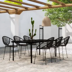 ¡Crea una estética atractiva y cohesionada en el espacio al aire libre de tu casa con este juego de comedor para jardín! Esta mesa de comedor está hecha de una estructura de acero con recubrimiento en polvo, robusta y estable para el uso diario al aire libre. La superficie de vidrio liso es fácil de limpiar con un paño húmedo y es perfecto para colocar comidas, bebidas y otros artículos decorativos. Estas sillas de patio están hechas de mimbre de PVC negro y estructura de acero con recubrimiento en polvo, robustas y fáciles de limpiar. Las sillas de jardín, diseñadas con respaldos curvos y reposabrazos, te brindan una comodidad de asiento óptima. Nota: Para prolongar la vida de tus muebles de exterior, te recomendamos que los protejas con una funda impermeable. Mesa:Color: NegroMaterial: Acero con recubrimiento en polvo, vidrioDimensiones: 200 x 100 x 74 cm (largo x ancho x altoGrosor del vidrio: 5 mmSilla:Color: NegroMaterial: Ratán de PVC, aceroDimensiones: 57 x 57,5 x 82 cm (ancho x profundo x altoAltura del asiento desde el suelo: 44 cmApilableResistente a la intemperieRequiere montaje: SíLa entrega contiene:1 x Mesa6 x Sillas
