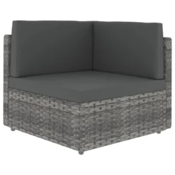 Este juego de salón de jardín combina estilo y funcionalidad y es una opción ideal para relajarte y disfrutar del buen tiempo, echar una siesta o charlar con tu familia o amigos. Gracias al ratán PE resistente a la intemperie, el asiento es fácil de limpiar, duradero y adecuado para el uso diario. El sofá posee una robusta estructura de acero con recubrimiento en polvo, que es muy duradero. La mesa de café con superficie vidrio templado puede sujetar tus libros, revistas y té para disfrutar de un momento relajante. También es ligero y modular, lo que lo hace completamente flexible y fácil de mover para adaptarse a cualquier entorno. Los cojines gruesos y extraíbles son muy cómodos. Puedes combinarlo con otros asientos modulares disponibles en nuestra tienda y ¡crear tus configuraciones personales de sofás de jardín! Nota: Para prolongar la vida útil de los muebles de exterior, te recomendamos que los limpies con regularidad y no los dejes al aire libre sin protección innecesariamente.Limpieza: Usa una solución de jabón suave.Almacenamiento: Si es posible, guarda el producto en un lugar fresco y seco en el interior. Si el producto se almacena al aire libre, protégelo con una funda impermeable. Limpia y seca el exceso de agua o nieve de las superficies planas después de una lluvia o nevada. Permite la ventilación para evitar daños relacionados con la humedad. Color: GrisColor de cojín: Gris antracitaMaterial: Ratán PE, tela (100% poliéster, acero con recubrimiento en polvo, vidrio templadoDimensiones mesa de centro: 90 x 50 x 26 cm (largo x ancho x altoDimensiones del sofá del medio: 58,5 x 65,5 x 52 cm (ancho x fondo x altoDimensiones del sofá de la esquina: 65,5 x 65,5 x 52 cm (ancho x fondo x altoDimensiones del sofá de esquina (con reposabrazos izquierdo/derecho: 78,5 x 65,5 x 52 cm (ancho x profundo x altoGrosor del cojín: 8 cmRequiere montaje: SíLa entrega incluye:1 x Mesa de centro4 x Sofás centrales1 x Sofá de esquina1 x Sofá esquinero con reposabrazos izquierdo1 x Sofá esquinero con reposabrazos derecho7 x Cojines de asiento8 x Cojines de respaldo