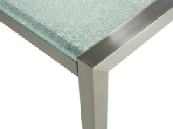 Mesa de exterior. Añade elegancia a tu zona exterior con esta mesa de comedor. Está fabricada a partir de acero inoxidable duradero y vidrio templado. Tiene una capacidad para 6 personas. La combinación de materiales de alta calidad y el diseño elegante aportan un estilo definido. Detalles: Tipo de Producto: Mesa de comedor Estilo: Moderno Color: Transparente Tipo de material: Vidrio Material principal: Vidrio templado Material de la superficie: Vidrio Forma: Rectangular Acabado: Brillante Dimensiones: Ancho: 90 cm Longitud: 180 cm Altura: 76 cm Peso: 90 kg Capacidad de peso: 70 kg La oferta incluye: 1 x Mesa Ventajas: Perfecto para todo tipo de exterior, Diseño atemporal, Materiales reciclables y ecológicos, Tablero en vidrio templado de seguridad, Montaje muy sencillo Información de montaje: Requiere montaje completo. 20-40 min. Información adicional: Las manchas blancas visibles en la mesa después de la lluvia son una característica típica del producto, no un defecto de calidad. El producto viene con un libro de cuidados detallado para ayudarte a mantener tus muebles en las mejores condiciones durante muchos años. Consulta estos consejos para garantizar el mantenimiento adecuado de tus muebles nuevos – encontrarás las instrucciones de mantenimiento junto con el manual de montaje. Texto de resistencia: El producto es resistente al agua, lo que significa que no se dañará expuesto a la lluvia o en contacto con otros líquidos. Puede dejarlo al aire libre incluso durante fuertes lluvias o humedad. Durante la temporada de invierno es recomendable almacenar el producto en el interior o bajo una cubierta impermeable. Resistencia: Agua Consejos de mantenimiento: Acero inoxidable: 1.Las lluvias ácidas, el agua salada y las tormentas de arena pueden dañar la capa protectora 2.Durante el invierno, utilice una funda protectora o guarde los muebles en el interior 3.Durante la lluvia, se recomienda utilizar una funda protectora 4.Limpiar solo con agentes de limpieza suaves. No utilice limpiadores alcalinos o ácidos. Vidrio templado: 1.Para evitar rayones, no use un limpiador cremoso 2.Limpiar con un detergente suave o acondicionador de vidrio con un paño suave. Secar después de limpiar 3.Secar después de la lluvia o la nieve. Durante el invierno, utilice una funda protectora o guarde los muebles en el interior.