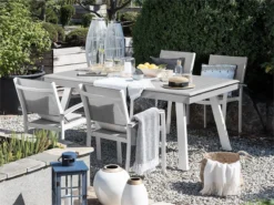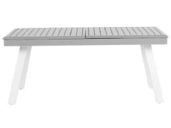 Mesa con extensión. Disfruta de tus comidas en el jardín y fiestas al aire libre con tus amigos gracias a esta mesa funcional. Hecha de aluminio robusto pero ligero, es resistente a los rayos UV y no se desvanece con el tiempo. La superficie de la mesa con listones brillantes se puede extender gracias a la hoja incluida para acomodar hasta diez personas. Esta elegante pieza inspirada en formas industriales funciona muy bien con cualquier espacio exterior moderno, contemporáneo o tradicional. Detalles: Tipo de Producto: Mesa de jardín Estilo: Moderno Color: Gris Tonalidad: Gris claro Tipo de material: Metal Material principal: Aluminio Material de las patas: Metal Material de la superficie: Metal Forma: Rectangular Acabado: Revestimiento en polvo Dimensiones: Ancho: 100 cm Longitud: 175/255 cm Altura: 73 cm Peso: 38 kg Capacidad de peso: 40 kg La oferta incluye: 1 x Mesa Ventajas: Perfecto para todo tipo de exterior, Muy fácil de conservar, Solida estructura, La mesa extensible proporciona espacio adicional, Estructura sólida y estable Información de montaje: Requiere montaje parcial. 5-15 min. Texto de resistencia: El producto es resistente al agua, lo que significa que no se dañará expuesto a la lluvia o en contacto con otros líquidos. Puede dejarlo al aire libre incluso durante fuertes lluvias o humedad. Durante la temporada de invierno es recomendable almacenar el producto en el interior o bajo una cubierta impermeable. Resistencia: Agua Consejos de mantenimiento: Aluminio: 1.Limpiar con agua jabonosa y detergentes suaves. Quitar el polvo con un paño suave 2.Fuera de temporada, utilice una funda protectora o guarde los muebles en un lugar fresco y seco.