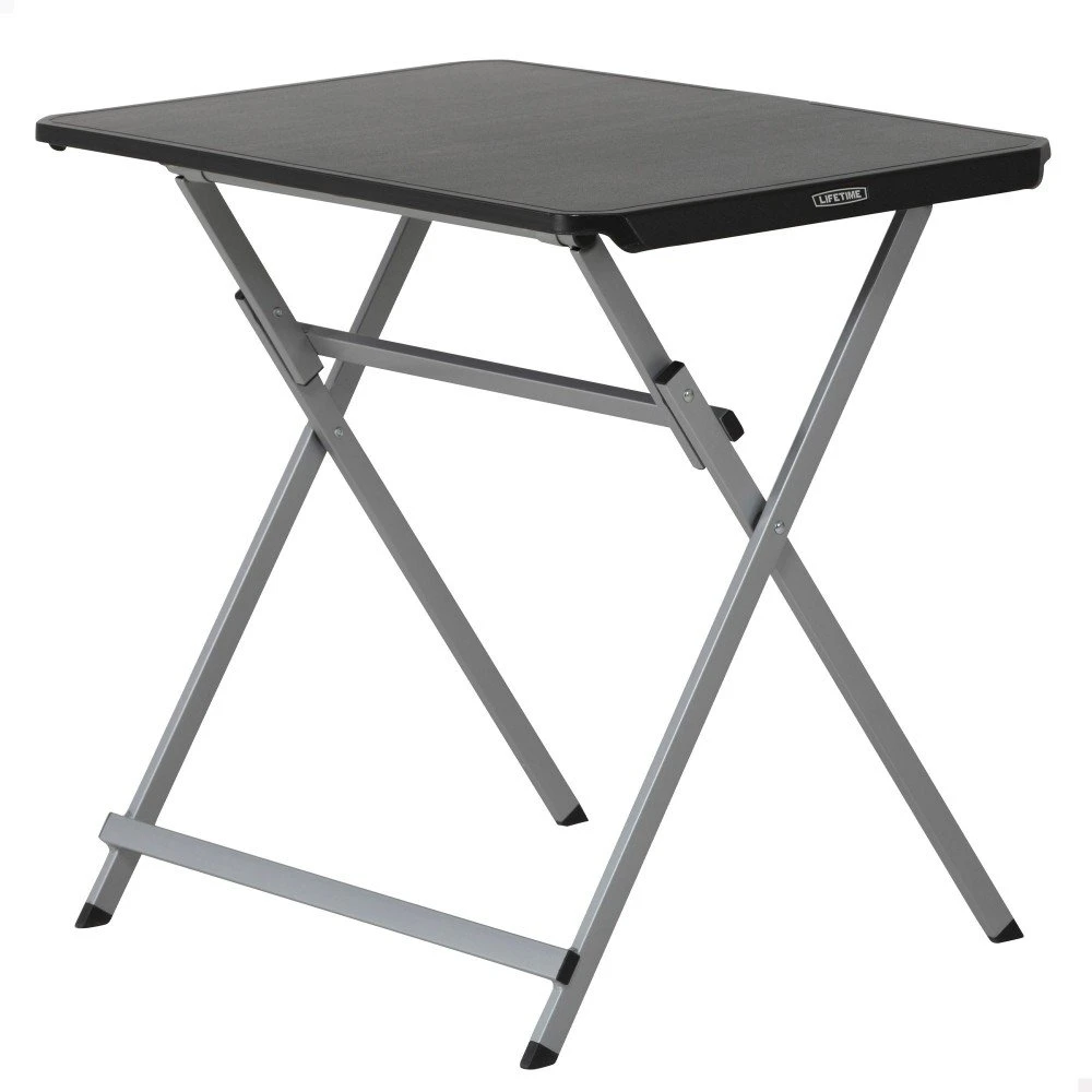 Mesa plegable negra de uso individual Lifetime. Tablero de polietileno de alta densidad con protección UV y estructura robusta de acero con revestimiento en polvo antióxido. Medidas tablero: 75 x 50,5 cm, altura: 66 cm. Sus patas y tablero se pliegan verticalmente y cuenta con asa de transporte para moverla fácilmente y almacenarla sin apenas ocupar espacio. Duradera, resistente y ligera. Perfecta para uso personal.