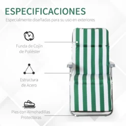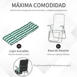 - – CONJUNTO DE 2 TUMBONAS: Este producto incluye 2 sillas plegables de idénticas características. Ideal para crear una zona de solárium al lado de la piscina o un espacio sombreado donde tumbarte a descansar bajo una sombrilla, una pérgola o bajo la sombra de los árboles – RESPALDO RECLINABLE: Los respaldos de las sillas de playa son reclinables y se pueden regular en 5 posiciones diferentes, para adaptarse a las necesidades de cada momento y usuario. Permitiéndote sentarte a leer o acostarte para echarte una siesta, por ejemplo – PLEGABLE Y CON COJÍN: Estas tumbonas reclinables tienen un diseño plegable para que puedas guardarlas y transportarlas fácilmente de un lugar a otro. Ideal para llevar de acampada, de camping, o para tener en el jardín, patio o terraza – ESTRUCTURA LIGERA Y RESISTENTE: Sin renunciar a su ligereza, estás tumbonas para exterior están fabricadas con un marco de acero, reposabrazos de PP y cojín de cuerpo entero de 6 cm de grosor con funda de poliéster de 160 g/m² y relleno de algodón sintético. Ofrecen una gran resistencia a la intemperie y a la oxidación – MEDIDAS TOTALES: 60x75x50-102 cm (LxANxAL. Medidas plegadas: 92×61,5×12 cm (LxANxAL. Peso máximo soportado: 120 kg cada una. Certificaciones: EN581-1-2. Requiere montaje
