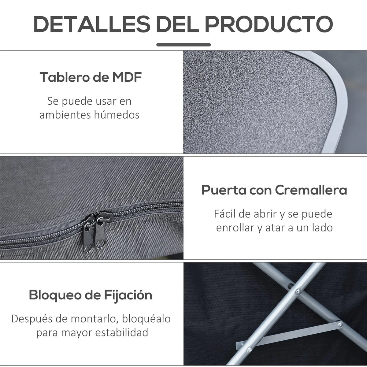 Este armario de camping de Outsunny es perfecto para ir de camping, acampada, picnic, barbacoas, fiestas y otras actividades al aire libre. Su diseño plegable facilita su almacenaje y transporte y, además, es fácil de montar y se lava fácilmente con un paño húmedo. Compuesto por una encimera en la parte superior y un armario organizador de 3 niveles debajo para que puedas almacenar comida, platos y otros utensilios ¡Disfruta de deliciosas comidas al aire libre con este armario de camping! Características – Mesa portátil ideal para ir de camping, acampada, picnics, barbacoas, fiestas u otras actividades al aire libre – Con marco de metal resistente y armario con 3 estantes de tela Oxford y encimera y estantes de MDF – Desmontable y plegable para un fácil almacenamiento y transporte – La puerta con cremallera se puede enrollar y atar a un lado – Tela Oxford con revestimiento de PVC resistente al agua – Encimera con bordes redondeados para evitar golpes y daños accidentales – Bolsa de transporte incluida Especificaciones – Color: negro – Material: metal, tela Oxford y MDF – Medidas totales: 58X65x93 cm (LxANxAL – Medidas plegadas: 77x68x12 cm (LxANxAL – Medidas de la puerta: 43×61,5 cm (LxAL – Medidas de cada estante: 47x50x24 cm (LxANxAL – Carga máxima: 23 kg (mesa y 10 kg (estante – Referencia: A20-197