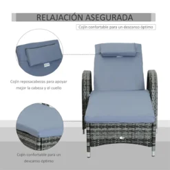 Este conjunto de 2 tumbonas para exterior de Outsuuny tiene una estructura de metal galvanizado cubierta con poliratán, con gran resistencia a la intemperie y a los rayos UV. Su respaldo tiene 5 posiciones ajustables para que puedas sentarte a leer un libro o tumbarte a tomar el sol. Viene con el cojín de cuerpo entero incluido y uno para la cabeza. Además, tiene 2 ruedas en la parte del respaldo para mover con facilidad. Características – Tumbona con estructura metálica robusta y resistente a la intemperie y a la corrosión – Fabricada con poliratán PE, duradero y resistente a los rayos UV – Las 5 posiciones reclinables del respaldo permiten sentarte, tumbarte o acostarte – Con apoyabrazos laterales, para mayor alivio de tensión en espalda y hombros – Con dos ruedas en la parte posterior para mover y transportar con facilidad – Requiere montaje Especificaciones – Color: gris mixto (tumbona y gris (cojín – Material: ratán PE, metal, PE, tejido de poliéster y caucho – Medidas totales: 200x73x72-103 cm (LxANxAL – Medidas del respaldo: 50×79 cm (LxAL – Medidas del asiento: 57×120 cm (LxAN – Altura del asiento al suelo: 30 cm – Ancho del reposabrazos: 8 cm – Medidas del cojín reposacabezas: 37x17x5 cm (LxANxAL – Carga máxima: 160 kg – Certificaciones: EN581-1-2 – Referencia: 862-P007