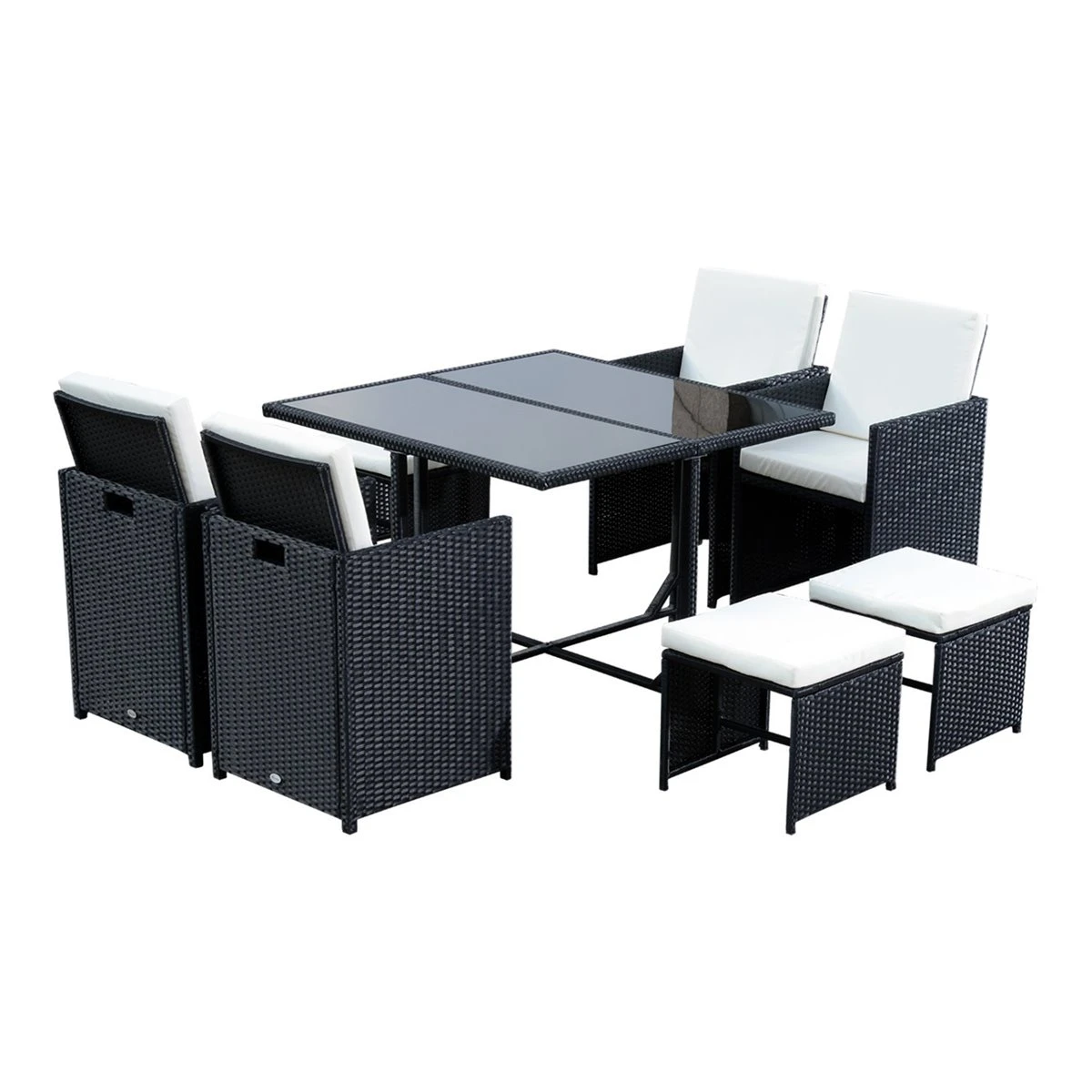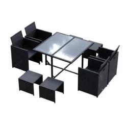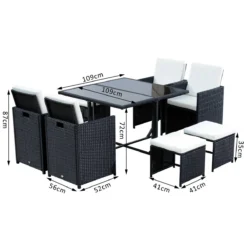 ¿Estás buscando muebles para tu jardín o terraza? Presentamos un conjunto de muebles de exterior clásico y elegante de poliratán. El conjunto tiene 9 piezas: 1 mesa, 4 sillas y 4 taburetes con cojín suave, grueso y lavable. El poliratán es una alternativa al ratán natural pero más resistente y apto para la intemperie. Los taburetes se pueden meter bajo las sillas y estas se esconden debajo de la mesa para ahorrar espacio. Estos muebles de jardín son muy prácticos y decorativos. Características – Conjunto de 9 piezas: 1 mesa de vidrio templado, 4 sillas y 4 taburetes con cojín suave – Adecuado para jardín, terraza, balcón, etc. – Fabricado en ratán de polietileno que asegura un largo uso – Mesa de comedor con almohadillas ajustables para los pies que pueden proteger el piso y agregar más estabilidad en terrenos irregulares – Su especial diseño permite que los taburetes se pueden meter bajo las sillas y las sillas se esconden bajo la mesa fácilmente para ahorrar espacio – Estructura robusta de tubo de metal galvanizado – Cojín cubierto por tela de poliéster lavable relleno de algodón suave de grosor 5 cm Especificaciones – Color: negro y blanco – Material: ratán PE, metal galvanizado, poliéster y vidrio templado – Medidas de la mesa: 109x109x72 cm (LxANxA – Medidas de la silla: 56x52x87 cm (LxANxA – Medidas del taburete: 41x41x35 cm (LxANxA – Capacidad de carga: (silla 120 kg, (taburete 60 kg, (mesa 50 kg – Referencia: 841-105