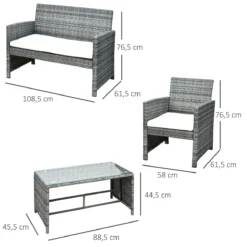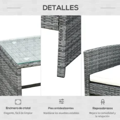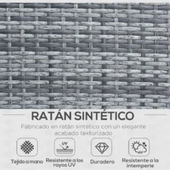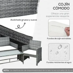 Ilumina tu jardín con este elegante conjunto de muebles de ratán sintético de Outsunny y haz que el exterior de tu casa luzca tan bien como el interior. Este set se compone de 2 sillones individuales, 1 sofá doble y una preciosa mesa de centro con encimera de cristal. Decorativo y funcional, este juego de muebles de exterior creará un ambiente bonito y acogedor para disfrutar con tus amigos o familiares. Características – Conjunto de muebles de ratán sintético compuesto por 1 sofá doble, 2 sillones individuales y 1 mesa de centro – Mueble con estructura de acero y revestido en ratán PE de gran resistencia a la intemperie y apto para uso prolongado – Cojines de asiento con funda extraíble para facilitar su limpieza – La mesa tiene una encimera de vidrio templado, resistente y fácil de limpiar – Perfecta para usar junto a la piscina, jardín, terraza o cualquier otro espacio al aire libre – Fácil de montar Especificaciones – Color: gris y beige – Material: mimbre PE, poliéster, acero y cristal – Medidas del sofá individual: 58×61,5×76,5 cm (LxANxAL – Medidas del sofá doble: 108,5×61,5×76,5 cm (LxANxAL – Medidas de la mesa de centro: 88,5×45,5×44,5 cm (LxANxAL – Medidas del cojín individual: 49x49x5 cm (LxANxAL – Medidas del cojín doble: 99x49x5 cm (LxANxAL – Carga máxima: 160 kg (asiento individual y 80 kg (mesa – Referencia: 841-173