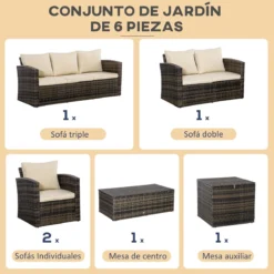 Dale vida a tu espacio exterior con este conjunto de mobiliarios de ratán para jardín de Outsunny. Con capacidad para 7 personas, es ideal para reunirse con la familia y amigos. Está compuesto por 4 sofás, 2 individuales, 1 doble y 1 triple. Y tiene dos mesas, ambas con espacio de almacenaje en su interior. Una gran opción para moblar tu jardín, terraza, patio, etc. Características – Conjunto de muebles de jardín con estructura de metal y ratán sintético de polipropileno (PE – Con cojines acolchados gruesos para un confort óptimo – Con capacidad para hasta 7 personas al mismo tiempo – Diseño clásico que combina con cualquier decoración de interior y exterior – La mesa de té y la mesa auxiliar a la vez hacen la función de baúl de almacenamiento – Fundas de cojines con cremallera para facilitar su limpieza – Requiere montaje Especificaciones – Color: marrón y beige – Material: ratán PE, metal galvanizado y poliéster – Medidas del sofá triple: 183x72x77 cm (LxANxAL – Medidas del sofá doble: 128x72x77 cm (LxANxAL – Medidas de los sillones: 72x72x77 cm (LxANxAL – Medidas de la mesa de centro: 120x60x40 cm (LxANxAL – Medidas internas de la mesa de centro: 116x56x35 cm (LxANxAL – Medidas de la mesa auxiliar: 70x70x64 cm (LxANxAL – Medidas internas de la mesa auxiliar: 66x66x59 cm (LxANxAL – Grosor de los cojines: 6,5 cm (asiento y 15 cm (respaldo – Carga máxima: 160 kg (cada asiento, 70 kg (mesa de centro y 50 kg (mesa auxiliar – Certificaciones: EN581-1-2 – Referencia: 860-120BG