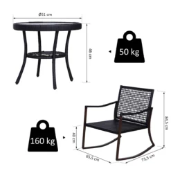 - – CONJUNTO DE MUEBLES DE JARDÍN: Este juego de 3 piezas está compuesto por 2 sillas mecedoras y 1 mesa auxiliar que agregarán elegancia a cualquier espacio exterior como patio, jardín, terraza o balcón y te permitirá relajarte en compañía – SILLAS CÓMODAS: Cada silla mecedora cuenta con un respaldo y reposabrazos ergonómicos, para ofrecerte una experiencia de lo más relajada. Incluye cojines y almohadas para un sentado más suave y cómodo – MESA DE CENTRO: La mesa de este conjunto, tiene un diseño elegante y encimera de vidrio templado de 5 mm de grosor, perfecta para tomar un refresco por las tardes o un café recién hecho por la mañana, mientras te balanceas en la mecedora – RESISTENTE Y FÁCIL DE LIMPIAR: Con estructura de metal con recubrimiento en polvo resistente a la corrosión y cubierto de ratán PE, con gran resistencia a la intemperie, a los rayos UV y decoloración. Conjunto fácil de limpiar. Las fundas de los cojines tienen cremallera y se pueden sacar para lavar – MEDIDAS TOTALES: mesa Ø51×46 cm (DiámxAL y silla 65,5×73,5×84,5 cm (LxANxAL; Peso máximo soportado: 50 kg (mesa y 160 kg (silla