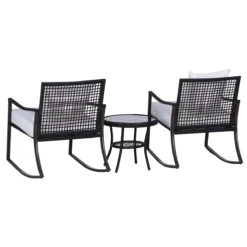 ¿Sabías que las mecedoras a parte de relajarnos revitalizan nuestro organismo y mejoran nuestra circulación? Es por eso, que Outsunny presenta este conjunto de 3 piezas compuesto por 2 sillas mecedoras y una mesa. Con estructura metálica y cubiertas con tejido de poliéster y ratán PE, tienen cojines y almohadas para que el asiento y respaldo sean lo más cómodos posibles y puedas sentarte y relajarte mientras te balanceas suavemente. La encimera de la mesa es de vidrio templado.