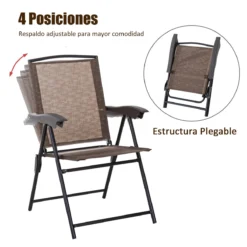 - – El conjunto incluye 1 mesa y 2 sillas. Se puede utilizar en interiores y exteriores. Es un elemento perfecto para el jardín, terraza, patio o cualquier espacio exterior – Las sillas están hechas de resistente tela de texteline de alta calidad con buena ventilación. La estructura es de resistente acero y no se deforma bajo el sol – Incluye 1 mesa de centro que viene con vidrio templado de espesor 5mm. Es muy fácil de limpiar – Sillas con diseño plegable para ahorrar espacio de almacenaje. El respaldo es reclinable a 4 niveles y viene con reposabrazos para mayor comodidad – Dimensiones de las sillas: 82.5x54x90 cm (LxANxAL, dimensiones de la mesa: Ø60×70 cm (DxAL, dimensiones del asiento: 44×43 cm (LxAN, altura del asiento: 43 cm. Capacidad máx. de carga de las sillas: 114 kg, capacidad máx. de carga de la mesa: 25 kg
