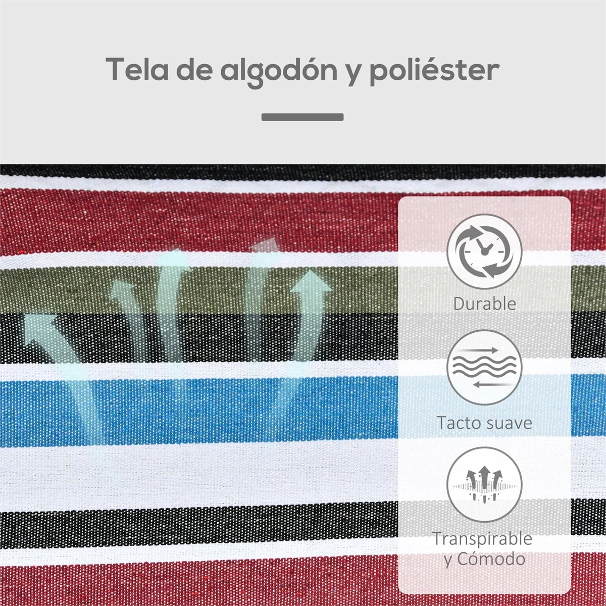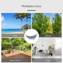 ¿Has visto esta hamaca de rayas multicolores de Outsunny? Ideal para disfrutar de una tarde tomando el sol o relajarte con un buen libro a la sombra de los árboles o en un soporte para hamacas (no incluido. Confeccionada en tela de algodón y poliéster con fuertes nudos de cuerda a cada lado y anillas de metal, soporta hasta 180 kg y tiene capacidad para que puedan tumbarse cómodamente 2 personas. Incluye una bolsa para que puedas llevártela a cualquier parte. Características – Hamaca de diseño moderno y actual con estampado de rayas multicolores – Perfecta para playa, parque, patio, bosque y otros espacios interiores y exteriores – Amplia hamaca que soporta hasta 180 kg y en la que pueden tumbarse cómodamente 2 personas – Tejido mixto de algodón y poliéster para mayor comodidad y absorción de la humedad – Bonito acabado con cuerdas en forma de red y borlas que agrega un toque de elegancia – Anillas de metal recubiertas con cuerda de algodón en ambos lados para un montaje fácil y resistente – Incluye bolsa para facilitar su almacenaje y transporte Especificaciones – Color: multicolor – Material: algodón y poliéster – Medidas totales: 285×150 cm (LxAN – Medidas de la cama: 200×150 cm (LxAN – Longitud de las borlas: 23 cm – Carga máxima: 180 kg – Certificaciones: EN 581-1-2 – Referencia: 84A-190