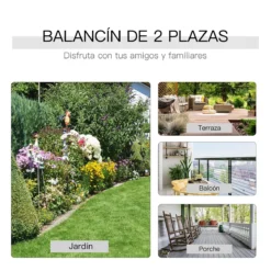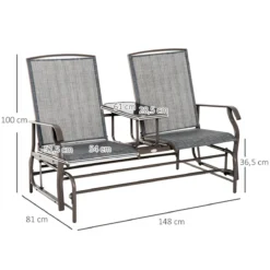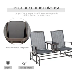 - – BANCO BALANCÍN DE 2 PLAZAS: Esta elegante mecedora de 2 plazas te permite disfrutar del sol en tu jardín, terraza, patio o junto a la piscina. Es un mueble perfecto que aportará un toque de elegancia allá donde lo coloques – BASCULANTE: Conectados a la estructura principal mediante los apoyabrazos, este banco con 2 asientos cuenta con función basculante para que puedas columpiarte fácilmente hacia adelante y atrás mientras descansas y te relajas – CON MESA INCLUIDA: Este balancín de jardín cuenta con una mesa central con encimera de vidrio templado fácil de limpiar, para que puedas tener un espacio donde colocar tu bebida, tentempié, libre, móvil, etc. – RESISTENTE: Este banco para exterior tiene una estructura robusta de metal y la base de los asientos y respaldos de cómoda tela de texteline transpirable. Ambos elementos combinados, ofrecen una gran capacidad de carga, soportando un peso de 165kg cada uno de los asientos – MEDIDAS TOTALES: 148x81x100 cm (LxANxAL; Medidas de los asientos: 54×51,5 cm (LxAN