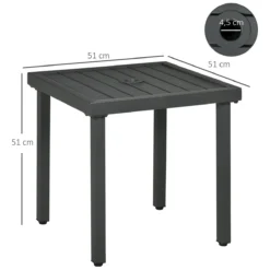 Hablar de una mesa pequeña no significa hablar de una mesa insignificante, ya que realmente son muebles fundamentales y muy prácticos tanto para nuestros espacios interiores como exteriores. Esta mesa auxiliar de Outsunny para jardín, además, tiene un orificio central para que puedas colocar tu sombrilla, ofreciendo un soporte para tus bebidas, libros y demás en medio de 2 tumbonas al lado de la piscina o junto a dos sillas o sillones en la terraza de tu casa. Características: Mesita auxiliar adecuada para cualquier espacio al aire libre como el jardín, patio o terraza Mesa pequeña adecuada para tener junto a las tumbonas, sillas y más La estructura de acero ofrece una gran resistencia y capacidad de carga Tratado con electroforesis antes del recubrimiento en polvo para proteger la mesa de la lluvia o la oxidación Mesa con orificio central para poder colocar una sombrilla y protegerte de los rayos del sol Pies con almohadillas ajustables para mantener el equilibrio de la mesa en suelos irregulares y no rayarlo Se requiere montaje Especificaciones: Color: gris Material: acero Medidas totales: 51x51x51 cm (LxANxAL Diámetro del orificio para sombrilla: Ø45 mm Carga máxima: 30 kg Referencia: 84G-034V00GY