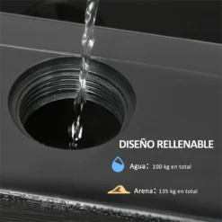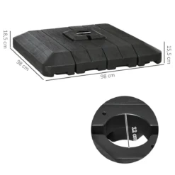 Si deseas que tu parasol voladizo esté siempre firme, estable y seguro en su lugar, estas placas de peso para base cruzada de Outsunny son perfectas. Fabricadas en PE, son 4 piezas que encajan fácilmente y pueden contener hasta 100 kg de agua y 135 kg de arena. Combina estas placas de peso con un parasol con base en cruz y crea tu propio oasis sombreado. Características – 4 Placas de peso para bases de sombrilla cruzadas (base no incluida – Fabricadas en PE resistente e ideal para uso en exteriores – Se puede llenar con hasta 100 kg de agua y 135 kg de arena – Cada placa tiene una tapa removible, facilitando así el llenado, vaciado y limpieza – Base plástica imitación madera para una apariencia más natural y rústica – Adecuado para tener en el jardín, en la piscina o en otros espacios al aire libre – Requiere montaje – Recomendado para parasoles con referencia: 84D-209 – Nota: la base cruzada NO está incluida Especificaciones – Color: negro – Material: PE – Medidas totales: 98x98x18,5 cm (LxANxAL – Distancia de instalación de tornillos para base en cruz: hasta 17 cm – Varilla transversal adecuada: dentro de Ø12 cm – Apto para tamaños de base de: 118×4,5×6 cm (LxANxAL – Peso neto: 13 kg – Referencia: 84D-239V00BK – Referencias de parasoles adecuados: X-84D-209 – Nota: Medir la base cruzada antes de comprar el producto para garantizar su compatibilidad