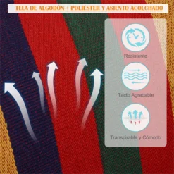 Relájate cómodamente durante horas en esta silla colgante de Outsunny. Hecha de tejido mixto de algodón y poliéster, es transpirable y muy resistente. Va colgada sobre una barra de madera que la mantiene estable y tensa. Ideal para interior y exterior, se puede colgar fácilmente en las ramas de un árbol, en el techo o en un soporte para tumbonas o sillas colgantes. Tiene un diseño multicolor a rayas con cuerdas acabadas en forma de red y borlas, que lucirá bonito en cualquier espacio. Características: Silla colgante muy ligera y fácil de transportar Tejido mixto de algodón y poliéster transpirable, muy confortable Diseño de rayas colorido con cuerdas rojas con terminaciones en forma de red y borlas Asiento ancho y cómodo Se puede colgar libremente en ramas de árboles, vigas o soportes para tumbonas o sillas colgantes Para mayor estabilidad al balanceo y resistencia, la silla va colgada en una barra de madera resistente que la mantiene tensada Cuerda estilo náutico, soporta hasta 100 kg de peso Requiere montaje Especificaciones: Color: multicolor:● Material: madera, algodón y poliéster Medidas totales: 100x60x100 cm (LxANxAL Medidas del asiento: 60×45 cm (LxAN Medidas del respaldo: 60×55 cm (ANxAL Medidas de la barra de madera: Ø3×90 cm (DiámxL Carga máxima: 100 kg Referencia: 84A-109