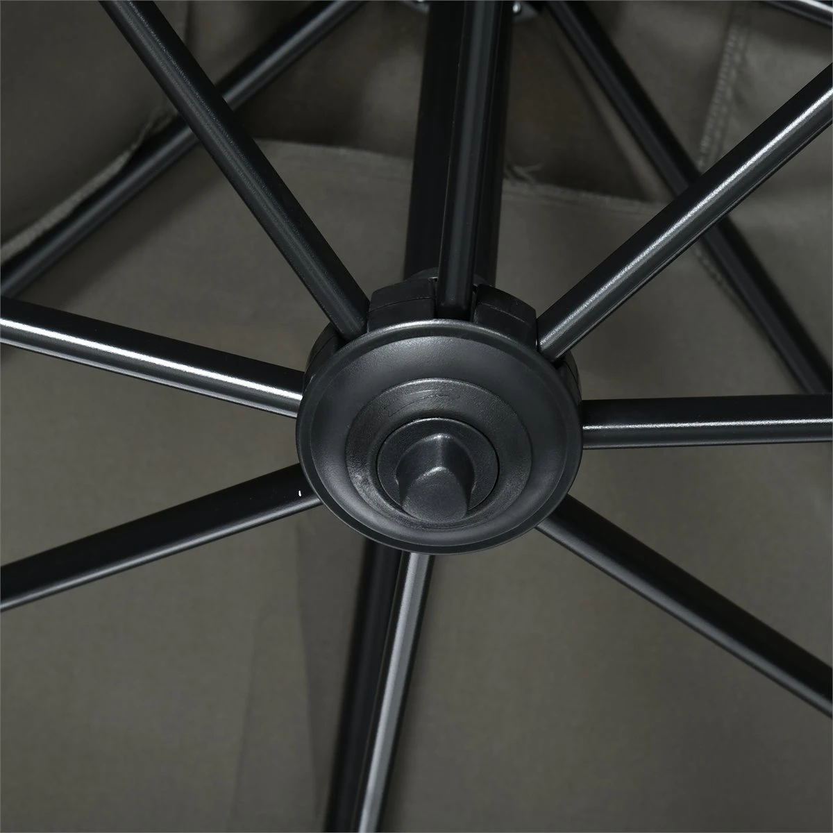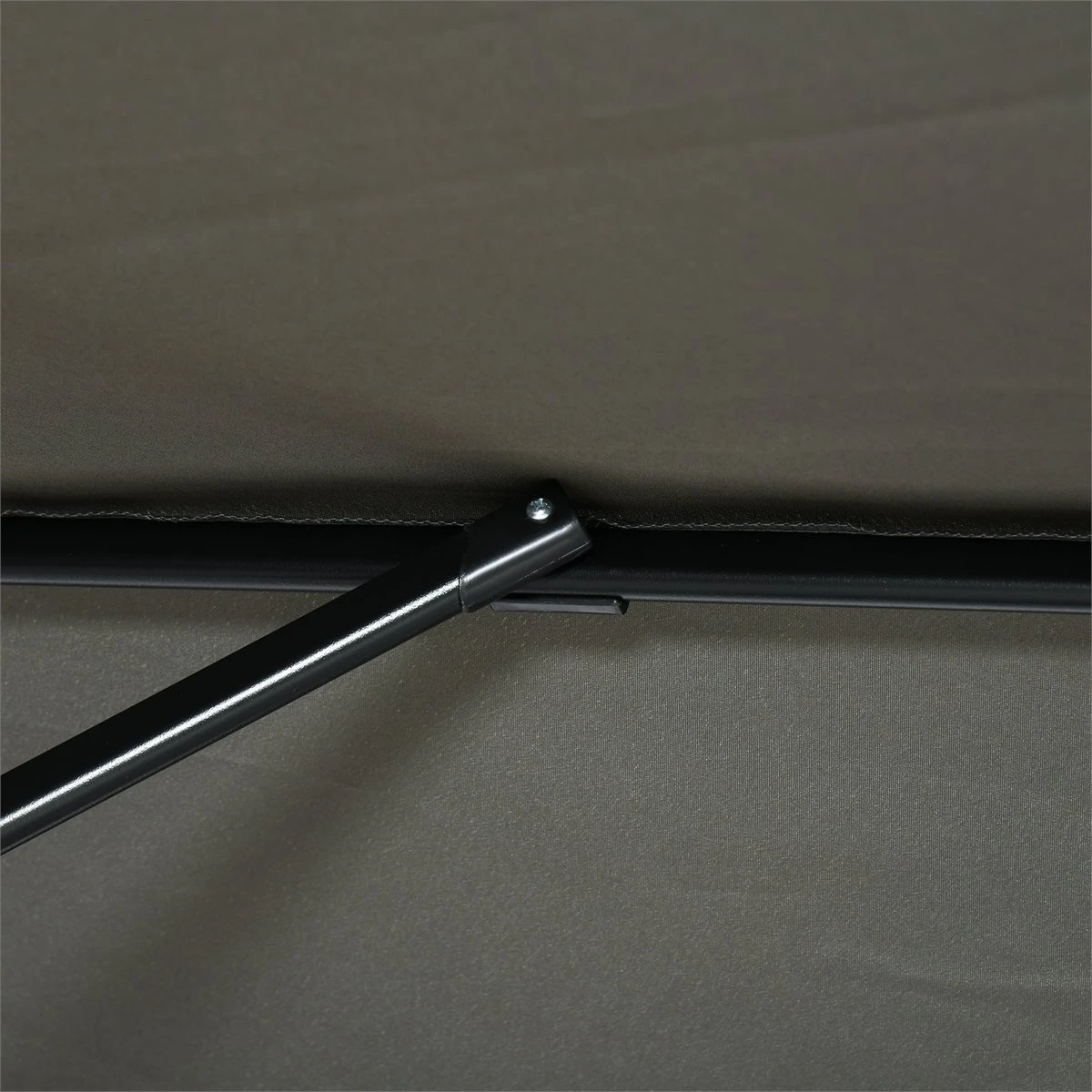Si buscas una sombrilla con soporte excéntrico, esta de Outsunny te gustará. Con estructura de metal y aluminio con 8 varillas, tiene un toldo que ofrece gran protección y se abre y cierra con manivela. Su techo, con ventilación, permiten que el viento y el aire fluyan más fácilmente. Pero lo mejor de todo es que es ajustable en ángulo, y cuenta con una base cruzada con soporte giratorio, que permite girarla hasta 360º para que puedas mover su orientación sin tener que cambiarla de lugar. Características – Sombrilla de grandes dimensiones para una mayor cobertura y protección solar – Sombrilla con poste lateral, también conocida como parasol excéntrico o sombrilla Cantilever – El tejido del toldo con ventilación permite que el viento y el aire cálido fluyan más fácilmente – Apertura fácil y rápida mediante manivela lateral – Poste de aluminio con 8 varillas de conexión para mayor resistencia y estabilidad – Mástil giratorio de 360 ° para orientar el toldo en cualquier dirección sin tener que mover la base – Con techo basculante con ángulo ajustable de 5 posiciones – Apta para usar en espacios exteriores al aire libre como jardín, terraza, patio, etc. – Incluye base cruzada, pero requiere pesos adicionales (no incluidos – Se requiere montaje Especificaciones – Color: gris – Material: aluminio, metal, tejido de poliéster (200 g/m² y policarbonato (PC – Medidas totales: 245x245x245 cm (LxANxAL – Medidas de la base cruzada: 100x100x4 cm (LxANxAL – Longitud de las varillas: 174 y 125 cm (largas, 63 y 61 cm (cortas – Especificaciones de las varillas: 22x13x0,5 mm (LxANxAL – Referencia: 84D-051V00GY