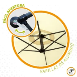 - Material: parasol de fibra de poliéster de 160 gramos y estructura de aluminio, tubo central de 48