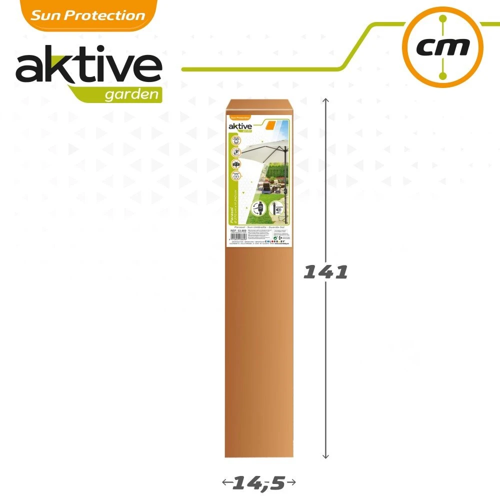 Parasol hexagonal para jardín Aktive Garden en color crema. Estructura de aluminio formada por 6 varillas y mástil para orientar la sombra de 38 mm de diámetro. El parasol mide 270×240 cm y es de poliéster de 150 gr/m2. Sistema de apertura y cierre con manivela manual. El techo del parasol es abierto y doble para favorecer la circulación del aire y hacerlo más estable si hace viento.