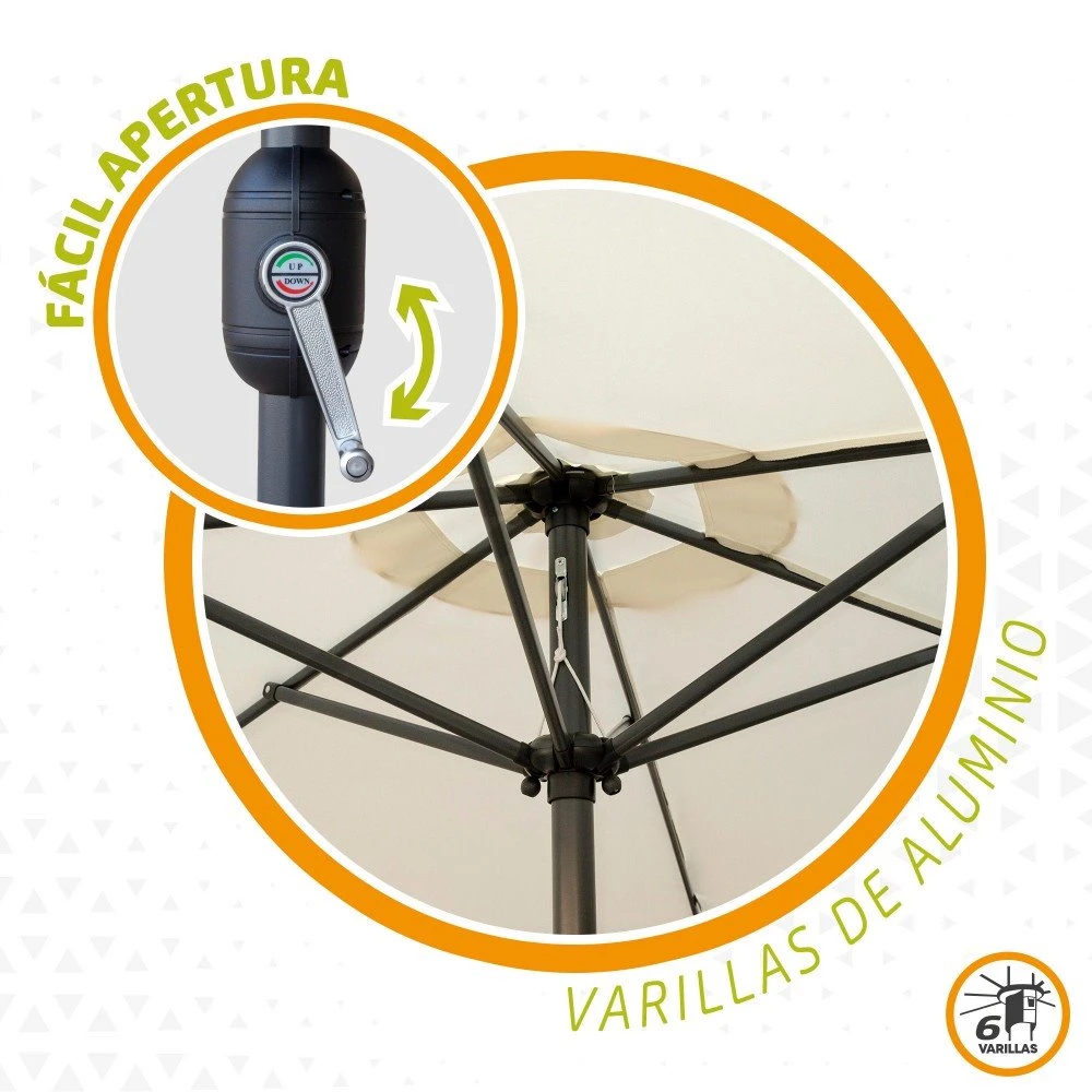 - Medidas: el diámetro del parasol es de 270 cm y la altura de 240 cm