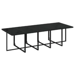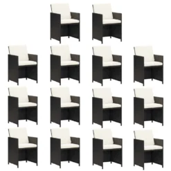 Este juego de comedor de jardín clásico, con un diseño elegante y contemporáneo, será una excelente opción para cenar o relajarse en el jardín. Apto para usar en exteriores: Hecho de ratán sintético resistente al agua y a la intemperie, este juego de comedor para jardín es fácil de limpiar, resistente y adecuado para usar a diario. Estructura robusta: Con una estructura de acero con recubrimiento en polvo, el juego de muebles de patio es robusto y duradero. Experiencia cómoda: El asiento y los cojines traseros gruesos, suaves y rellenos de espuma también añaden comodidad a los asientos. Diseño flexible: Puedes tirar del respaldo hacia abajo y almacenar las sillas debajo de la mesa, con el fin de ahorrar un valioso espacio de almacenamiento cuando no uses el conjunto. Gracias a la estructura ligera, todos los artículos son fáciles de mover. Nota:Para prolongar la vida de tus muebles de exterior, te recomendamos que los protejas con una funda impermeable. Color: NegroColor de cojines: Blanco cremaMaterial: Ratán PE, acero con recubrimiento en polvo, vidrio templadoMaterial del cojín: Tela (100% poliésterMaterial de relleno del cojín: EspumaDimensiones totales de la mesa: 275 x 107 x 74 cm (largo x ancho x altoDimensiones de la silla: 52 x 56 x 85 cm (ancho x profundo x altoDimensiones de asiento: 46 x 41 cm (ancho x profundoAltura del asiento desde el suelo: 45 cmAltura del reposabrazos desde el suelo: 64 cmDimensiones del cojín del asiento/respaldo: 46 x 41 x 5 cm (ancho x profundo x grosorRequiere montaje: SíLa entrega incluye:1 x Mesa con estructura extensible14 x Sillas14 x Cojines de asiento14 x Cojines de respaldo