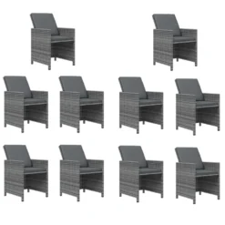 Este juego de comedor de jardín clásico, con un diseño elegante y contemporáneo, será una excelente opción para cenar o relajarse en el jardín. Apto para uso en exteriores: Hecho de ratán sintético resistente al agua y a la intemperie, este juego de comedor para jardín es fácil de limpiar, resistente y adecuado para usar a diario. Estructura robusta: Con una estructura de acero con recubrimiento en polvo, el juego de muebles de patio es robusto y duradero. Experiencia cómoda: El asiento y los cojines traseros gruesos, suaves y rellenos de espuma también añaden comodidad a los asientos. Diseño flexible: Puedes tirar del respaldo hacia abajo y almacenar las sillas debajo de la mesa, con el fin de ahorrar un valioso espacio de almacenamiento cuando no uses el conjunto. Gracias a la estructura ligera, todos los artículos son fáciles de mover. Nota:Para prolongar la vida de tus muebles de exterior, te recomendamos que los protejas con una funda impermeable. Color: GrisColor de cojín: Gris oscuroMaterial: Ratán PE, acero con recubrimiento en polvo, vidrio templadoMaterial del cojín: Tela (100% poliésterMaterial de relleno del cojín: EspumaDimensiones totales de la mesa: 275 x 107 x 74 cm (largo x ancho x altoDimensiones de la silla: 52 x 56 x 85 cm (ancho x profundo x altoDimensiones de asiento: 46 x 41 cm (ancho x profundoAltura del asiento desde el suelo: 45 cmAltura del reposabrazos desde el suelo: 64 cmDimensiones del cojín del asiento/respaldo: 46 x 41 x 5 cm (ancho x profundo x grosorRequiere montaje: SíLa entrega incluye:1 x Mesa con estructura extensible10 x Silla10 x Cojines de asiento10 x Cojines traseros