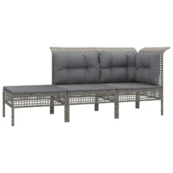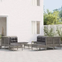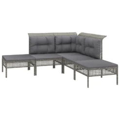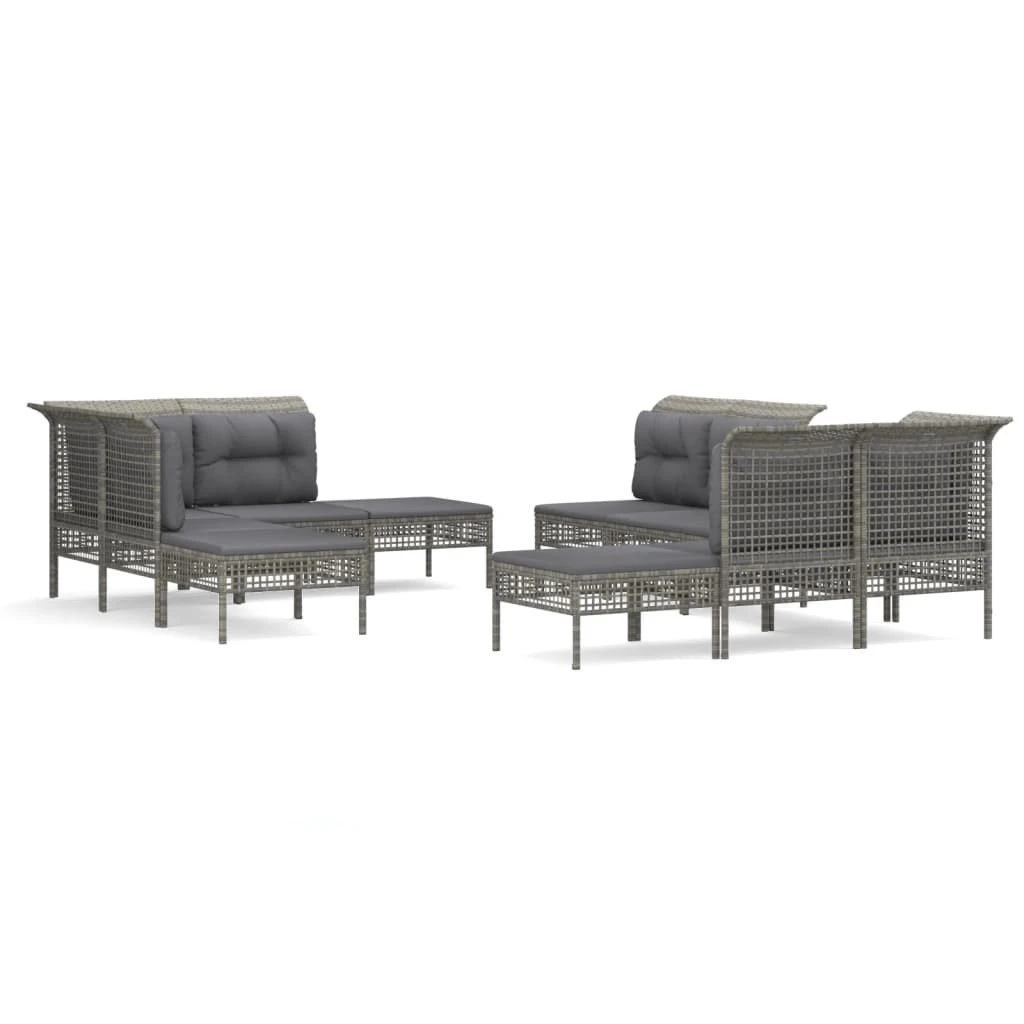 ¡Disfruta de un agradable café en el espacio al aire libre de la casa con este juego de muebles para jardín! Es un aporte perfecto para el jardín y la terraza, y crea además una impresión duradera. Material resistente a la intemperie: El ratán sintético es resistente a la intemperie y fácil de limpiar. La parte exterior se mantiene hermosa durante mucho tiempo. Es más económico que otros materiales, además de ofrecer una gran calidad, comodidad y aspecto estético.Estructura robusta y estable: La estructura de acero del conjunto de muebles garantiza su solidez y estabilidad.Cómodo asiento: El respaldo aporta un plus de comodidad al juego de muebles. Además, los cojines gruesos y acolchados proporcionan comodidad al asiento.Diseño modular: El juego de muebles de jardín es flexible y fácil de mover, por lo que puedes combinarlo con otros segmentos modulares de la tienda web para crear tus propias configuraciones personales de juegos de muebles para jardín. Nota:Para asegurarte de que tus muebles de exterior se mantengan hermosos, recomendamos protegerlos con una funda impermeable. Color: GrisColor de cojín: Gris oscuroMaterial: Ratán sintético, acero con recubrimiento en polvoSofá central:Dimensiones: 55 x 65 x 75 cm (ancho x profundo x altoAnchura del asiento: 55 cmProfundidad del asiento: 55 cmAltura del asiento desde el suelo: 32 cmDiseño de cuadrículaCapacidad de carga máxima: 110 kgSofá esquinero:Dimensiones: 65 x 65 x 75 cm (ancho x profundo x altoAnchura del asiento: 55 cmProfundidad del asiento: 55 cmAltura del asiento desde el suelo: 32 cmDiseño de cuadrículaCapacidad de carga máxima: 110 kgReposapiés: Dimensiones: 55 x 55 x 32 cm (ancho x profundo x altoDiseño de cuadrículaCapacidad de carga máxima: 110 kgCojín:Material: Tela (100% poliésterMaterial del relleno del cojín de asiento: EspumaMaterial del relleno del cojín de respaldo: Fibra de algodónDimensiones del cojín de asiento: 55 x 55 x 3 cm (ancho x profundo x grosorDimensiones del cojín de respaldo: 48 x 39 x 10 cm (ancho x profundo x grosor / 56 x 39 x 10 cm (ancho x profundo x grosorRequiere montaje: SíLa entrega incluye:5 x Sofás centrales2 x Sofás esquineros3 x Reposapiés10 x Cojines de asiento9 x Cojines traseros
