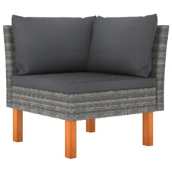 Este elegante y cómodo juego de salón de jardín es una opción ideal para relajarse y disfrutar del buen tiempo, echar una siesta o charlar con tu familia o amigos. Con una estructura de acero con recubrimiento en polvo recubierta con ratán PE, el juego de sofás de exterior es resistente a la intemperie y fácil de limpiar. Las patas macizas de madera de eucalipto contribuyen a su robustez y estabilidad. El juego de jardín se entrega con cojines acolchados gruesos para la máxima comodidad. Equipada con cremallera, la funda del cojín es extraíble y lavable. Además, este asiento de jardín se puede mover fácilmente para adaptarse a cualquier entorno con su construcción ligera. Nota: Para prolongar la vida útil de los muebles de exterior, te recomendamos que los limpies con regularidad y no los dejes al aire libre sin protección innecesariamente.Limpieza: Usa una solución de jabón suave.Almacenamiento: Si es posible, guarda el producto en un lugar fresco y seco en el interior. Si el producto se almacena al aire libre, protégelo con una funda impermeable. Limpia y seca el exceso de agua o nieve de las superficies planas después de una lluvia o nevada. Permite la ventilación para evitar daños relacionados con la humedad. Color: GrisColor de cojín: Gris antracitaMaterial: Ratán PE, acero con recubrimiento en polvo, madera maciza de eucalipto con un acabado al aceiteMaterial del cojín: Tela (100% poliésterDimensiones del sofá del medio: 60,5 x 64,5 x 67 cm (ancho x profundo x altoDimensiones del sofá de la esquina: 64,5 x 64,5 x 67 cm (ancho x profundo x altoDimensiones del reposapiés: 60 x 60 x 32 cm (ancho x profundo x altoProfundidad del asiento: 55,5 cmAltura del asiento desde el suelo: 32 cmGrosor del cojín del asiento: 5 cmRequiere montaje: SíLa entrega incluye:2 x Sofás de esquina1 x Sofá central1 x Reposapiés4 x Cojines de asiento5 x Cojines de respaldo