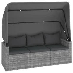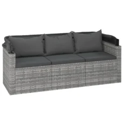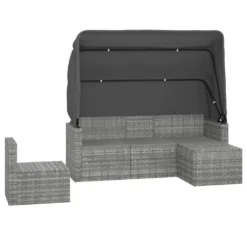 Este cómodo conjunto de sofás para jardín es una combinación perfecta de estilo y funcionalidad. Material duradero: El ratán PE, también conocido como ratán sintético, es resistente a la intemperie y fácil de limpiar. La parte exterior se mantiene hermosa durante mucho tiempo. Es más económico que otros materiales, además de ofrecer una gran calidad, comodidad y aspecto estético.Toldo plegable: Puedes regular el toldo con facilidad para satisfacer tus necesidades. Cierra el toldo para tomar el sol y ábrelo para relajarte a la sombra. Bloquea los nocivos rayos UV de forma eficaz y protege la piel de las quemaduras solares.Estructura estable: Las estructuras de acero con recubrimiento en polvo del juego de sofás para exterior garantizan la solidez y estabilidad.Práctico reposapiés: El taburete sirve para descansar los pies cuando te recuestas en el sofá y te ofrece un asiento adicional.Cómodo asiento: El juego de sofás de ratán sintético resulta muy cómodo gracias al asiento y al respaldo con acolchado grueso. Información útil:Para facilitar al máximo el montaje, cada producto se entrega con un manual. Nota:Para asegurarte de que tus muebles de exterior se mantengan hermosos, recomendamos protegerlos con una funda impermeable. Sofá de 3 plazas:Color: GrisMaterial: Ratán PE, acero con recubrimiento en polvoDimensiones: 178 x 64 x 151,5 cm (ancho x profundo x altoDimensiones del asiento: 160 x 62 cm (ancho x profundoAltura del asiento desde el suelo: 36 cmAnchura del reposabrazos: 8 cmAltura del reposabrazos desde el suelo: 55 cmCapacidad máxima de carga: 110 kgSofá central:Color: GrisMaterial: Ratán PE, acero con recubrimiento en polvoDimensiones: 54 x 63 x 60,5 cm (ancho x profundo x altoDimensiones de asiento: 53,5 x 53 cm (ancho x profundoAltura del asiento desde el suelo: 36 cmCapacidad máxima de carga: 110 kgReposapiés:Color: GrisMaterial: Ratán PE, acero con recubrimiento en polvoDimensiones: 53,5 x 53,5 x 36 cm (largo x ancho x altoCojín:Color: Gris oscuroMaterial de la cubierta: Tela (100% poliésterMaterial de relleno: Espuma, algodón PPDimensiones del cojín de asiento (sofá de 3 plazas: 62 x 52 cm (ancho x profundoDimensiones del cojín de asiento (sofá central: 53,5 x 53 cm (ancho x profundoDimensiones del cojín de respaldo (sofá de 3 plazas: 52 x 38 cm (ancho x profundoDimensiones del cojín de respaldo (sofá central: 56 x 39 cm (ancho x profundoDimensiones del cojín del reposapiés: 54 x 54 cm (ancho x profundoGrosor del cojín de asiento: 3,5 cmLa entrega incluye:1 x Sofá de 3 plazas2 x Sofás centrales1 x Reposapiés5 x Cojines de asiento5 x Cojines de respaldo1 x Cojín de taburete
