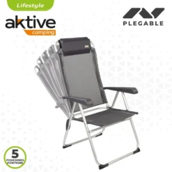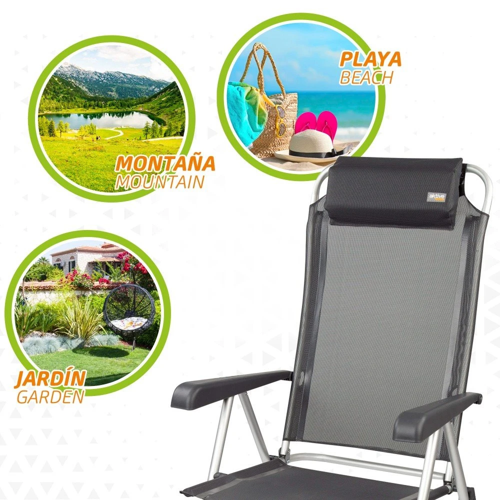 ¡Disfruta al aire libre con las sillas plegables Aktive! Silla plegable con medidas desplegada 44,5 x 55 x 101 cm, plegada 58 x 11 x 86,5 cm, altura del asiento de 38 cm. Ideal para ir a la playa, para disfrutar de un día de piscina en el jardín o para tus espacadas a la montaña o al camping. Tiene un diseño en color negro con tejido de textileno, un material que se lava con facilidad y que es resistente. Una silla plegable resistente con estructura de aluminio y asiento de textileno que soporta un peso máximo de 110 kg. Además, es mutiposición, ofrece 5 posiciones diferentes ajustables con los reposabrazos ergonómicos y tiene tacos antivuelco en las patas. Transpórtala con facilidad gracias a su peso ligero y a sus sistema de plegado fácil y rápido.