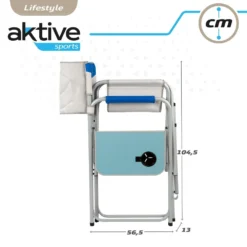 Silla plegable estilo director con altura XL de Aktive Sports, con medidas desplegada de 60 x 57 x 103 cm. Su asiento, respaldo y reposabrazos con almohadilla están fabricados con tela Oxford 600D en color azul y blanco. Cuenta con estructura de acero que soporta hasta 110 kg de peso y con tacos antideslizantes en las patas para mayor seguridad. En su lateral izquierdo tiene una mesa plegable lateral con posavasos y también lleva incorporado reposapiés de quita y pon. Se pliega en un solo movimiento para transportarla cómodamente y guardarla sin apenas ocupar espacio. ¡Disfruta como nunca de tus momentos al aire libre con Aktive!
