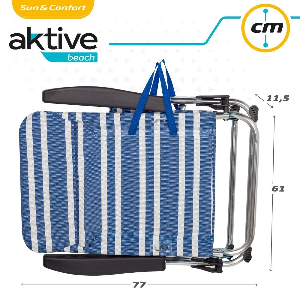 Silla de playa baja Aktive Beach diseño azul a rayas blancas con 5 posiciones, se tumba hasta quedar horizontal y se pliega por completo. Medidas 46,5 x 50 x 85 cm, con estructura tubular de 2 cm, asiento de textileno de 26 cm de alto y distancia entre reposabrazos de 61 cm de ancho. Tejido cómodo, flexible y de secado rápido. Incluye 1 asa para transportarla cómodamente y cuenta con tacos antideslizantes en las patas para mayor seguridad.