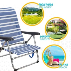 - Siéntate o túmbate cómodo cuando vayas a la playa con esta silla plegable baja y reclinable Aktive Beach en diseño marinero azul y rayas blancas
