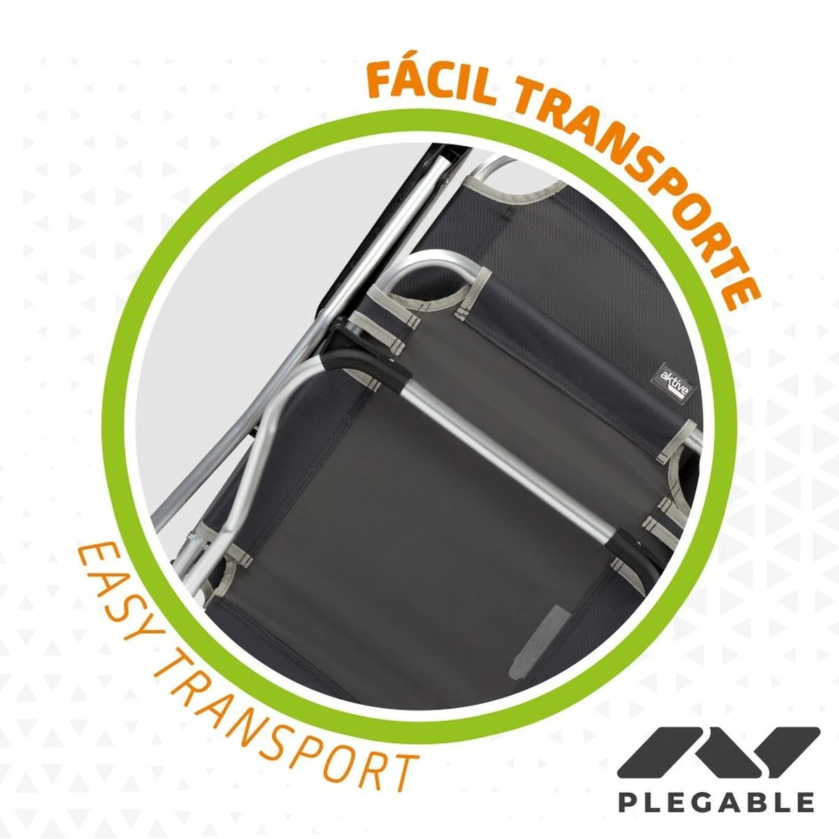 - Materiales: combina tejido poliéster y cuenta con estructura de aluminio con resposabrazos de plástico