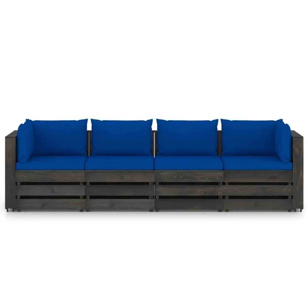 Este sofá de jardín de 4 plazas es una opción ideal para relajarte y disfrutar del buen tiempo, echar una siesta o charlar con tu familia o amigos. Con un diseño de palés atemporal, el sofá de madera agregará un toque de encanto rústico a tu patio, jardín o sala de estar. Hecho de madera de pino impregnada, el sofá de palés es duradero, resistente a la intemperie y respetuoso con el medio ambiente. Este sofá de exterior tiene una estructura maciza y requiere poco mantenimiento. Con cojines blandos y bien acolchados (no incluidos, el asiento de jardín te brinda la máxima comodidad. Nota: Para prolongar la vida útil de los muebles de exterior, te recomendamos que los limpies con regularidad y no los dejes al aire libre sin protección innecesariamente.Limpieza: Usa una solución de jabón suave.Almacenamiento: Si es posible, guarda el producto en un lugar fresco y seco en el interior. Si el producto se almacena al aire libre, protégelo con una funda impermeable. Limpia y seca el exceso de agua o nieve de las superficies planas después de una lluvia o nevada. Permite la ventilación para evitar daños relacionados con la humedad. Color del cojín: AzulMaterial: Madera de pino impregnada de grisMaterial del cojín: Tela (100% poliésterDimensiones de sofá esquinero: 69 x 70 x 66 cm (ancho x profundo x altoDimensiones del sofá central: 60 x 70 x 66 cm (ancho x profundo x altoGrosor del cojín del asiento: 6 cmGrosor del cojín del respaldo/lateral: 13 cmRequiere montaje: SíLa entrega incluye:2 x Sofás centrales2 x Sofás de esquina4 x Cojines de asiento6 x Cojines de respaldo/laterales